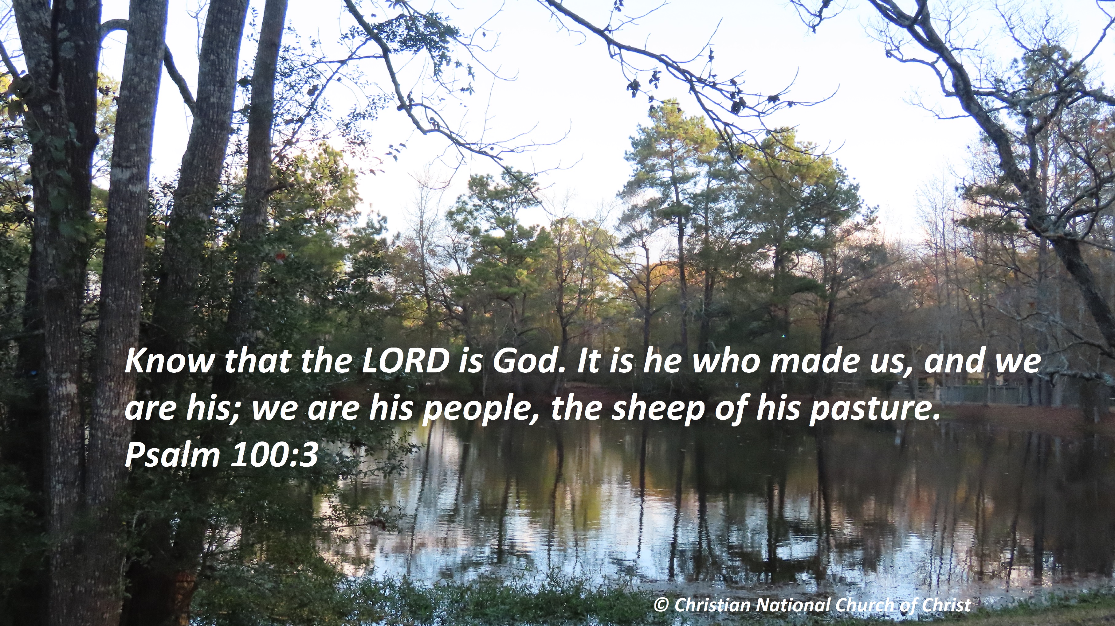 Uncategorized “God knows His own” Date: March 2, 2021Author: © Christian National Church of Christ 0 Comments Know that the LORD is God. It is he who made us, and we are his; we are his people, the sheep of his pasture. Psalm 100:3 Share this: Share on X (Opens in new window) X Share on Facebook (Opens in new window) Facebook Like Loading... Related