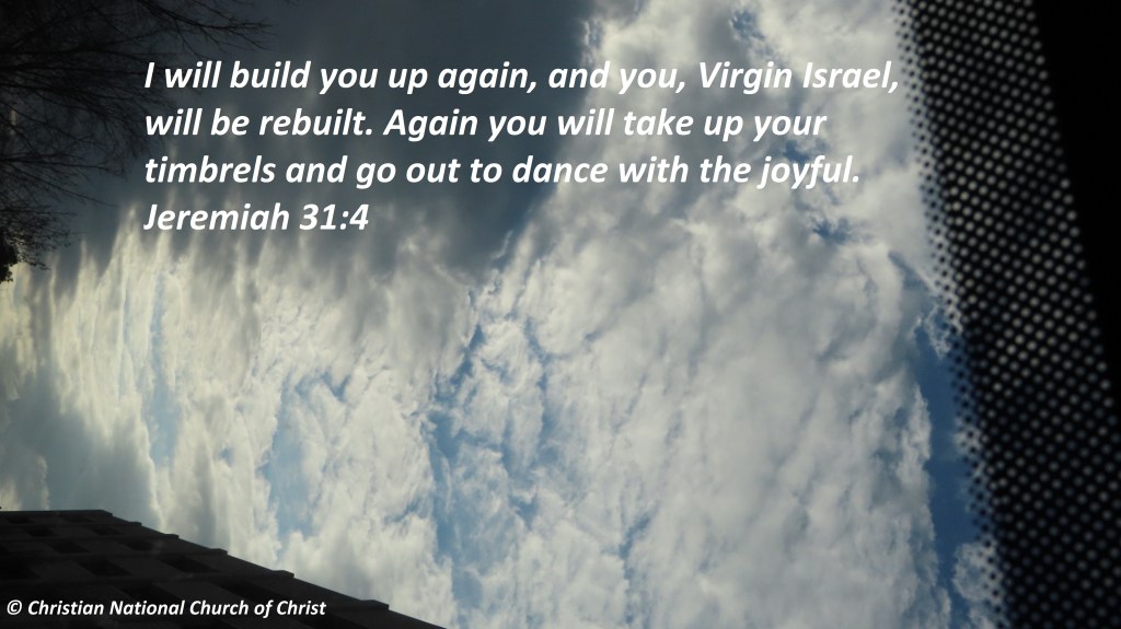 Uncategorized “Dance” Date: March 12, 2021Author: © Christian National Church of Christ 0 Comments I will build you up again, and you, Virgin Israel, will be rebuilt. Again you will take up your timbrels and go out to dance with the joyful. Jeremiah 31:4 Share this: Share on X (Opens in new window) X Share on Facebook (Opens in new window) Facebook Like Loading... Related