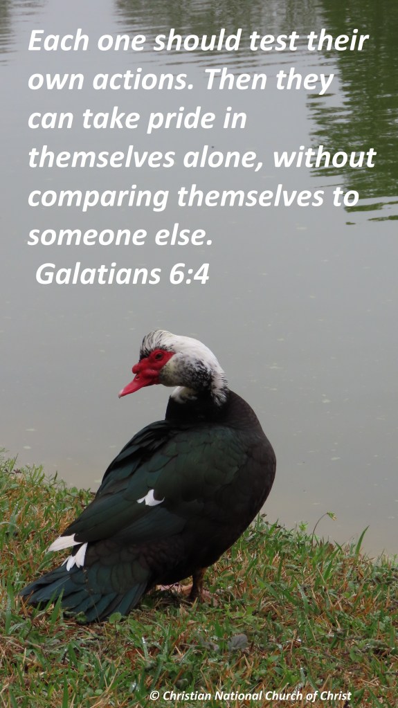 Uncategorized “Test Actions” Date: March 18, 2021Author: © Christian National Church of Christ 0 Comments Each one should test their own actions. Then they can take pride in themselves alone, without comparing themselves to someone else. Galatians 6:4 Share this: Share on X (Opens in new window) X Share on Facebook (Opens in new window) Facebook Like Loading... Related
