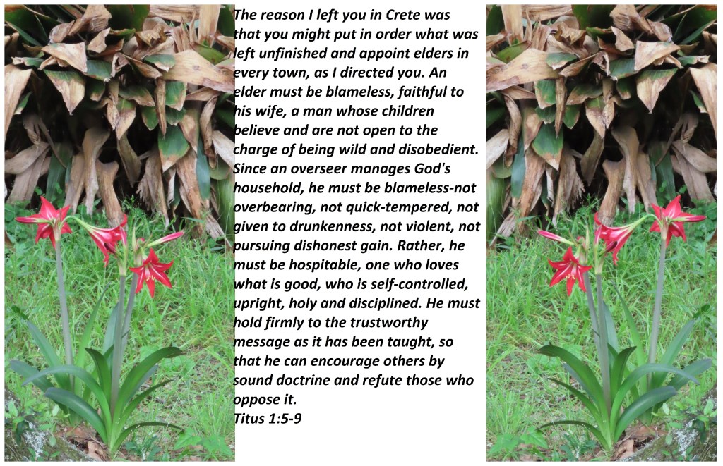 The reason I left you in Crete was that you might put in order what was left unfinished and appoint elders in every town, as I directed you. An elder must be blameless, faithful to his wife, a man whose children believe and are not open to the charge of being wild and disobedient. Since an overseer manages God’s household, he must be blameless-not overbearing, not quick-tempered, not given to drunkenness, not violent, not pursuing dishonest gain. Rather, he must be hospitable, one who loves what is good, who is self-controlled, upright, holy and disciplined. He must hold firmly to the trustworthy message as it has been taught, so that he can encourage others by sound doctrine and refute those who oppose it.