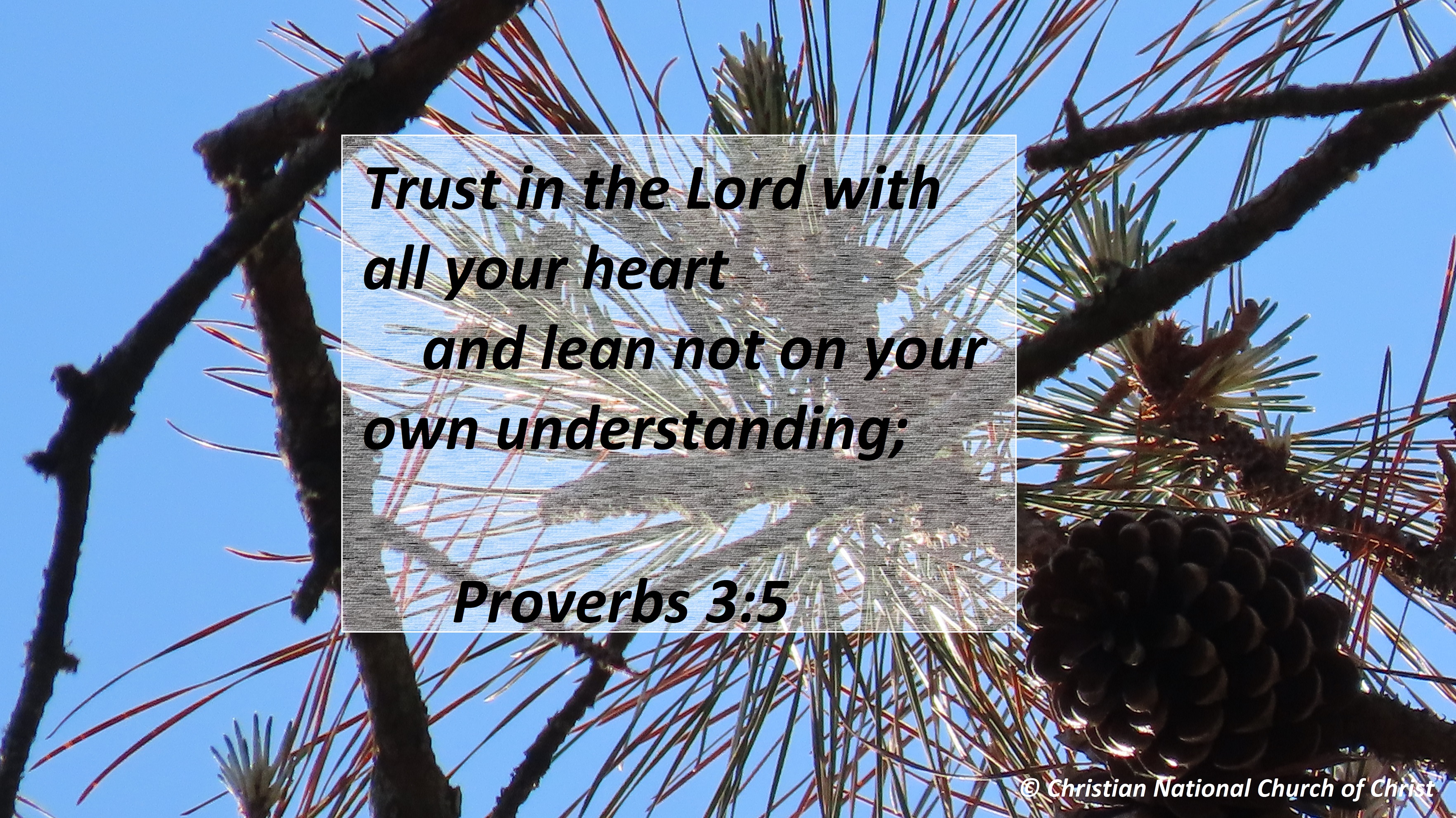 Uncategorized “Trust The Lord” Date: April 12, 2021Author: © Christian National Church of Christ 0 Comments Trust in the Lord with all your heart and lean not on your own understanding; Proverbs 3:5 Share this: Share on X (Opens in new window) X Share on Facebook (Opens in new window) Facebook Like Loading... Related