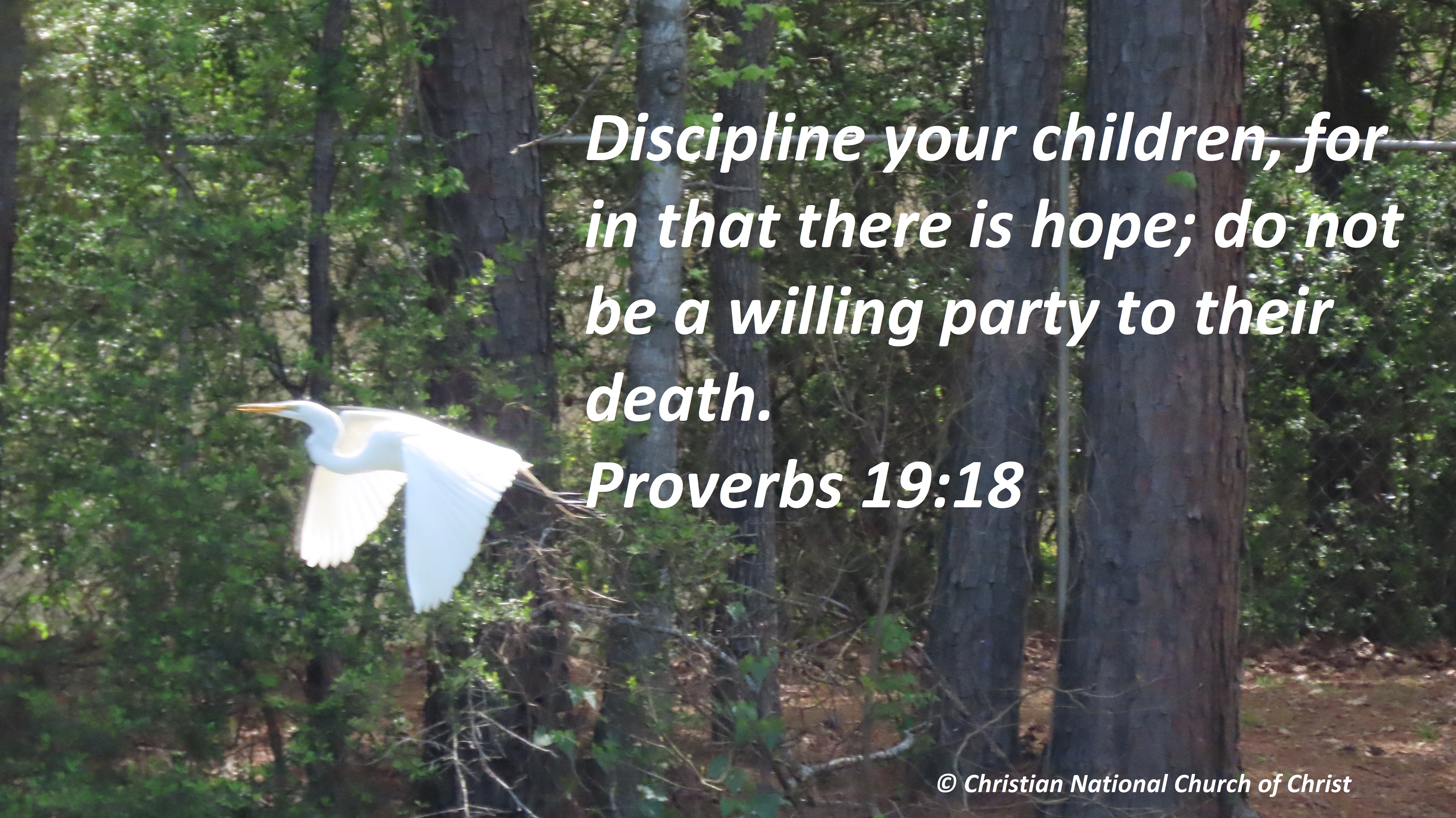 Uncategorized “There Is Hope” Date: April 14, 2021Author: © Christian National Church of Christ 0 Comments Discipline your children, for in that there is hope; do not be a willing party to their death. Proverbs 19:18 Share this: Share on X (Opens in new window) X Share on Facebook (Opens in new window) Facebook Like Loading... Related