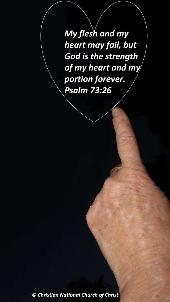 Uncategorized “Strong Heart” Date: May 1, 2021Author: © Christian National Church of Christ 0 Comments My flesh and my heart may fail, but God is the strength of my heart and my portion forever. Psalm 73:26 Share this: Share on X (Opens in new window) X Share on Facebook (Opens in new window) Facebook Like Loading... Related