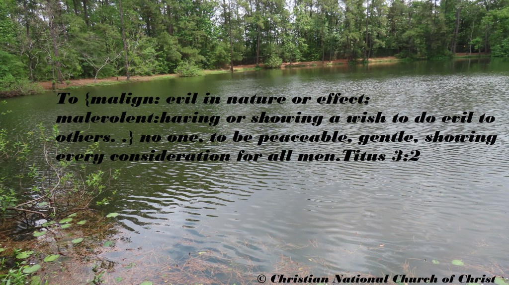 Uncategorized “Stop Gossip!” Date: May 6, 2021Author: © Christian National Church of Christ 0 Comments To {malign: evil in nature or effect; malevolent: having or showing a wish to do evil to others. .} no one, to be peaceable, gentle, showing every consideration for all men. Titus 3:2 Share this: Share on X (Opens in new window) X Share on Facebook (Opens in new window) Facebook Like Loading... Related