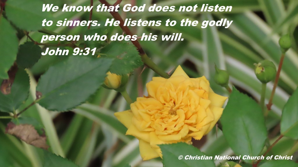 Uncategorized “Change! He Will Listen!” Date: May 17, 2021Author: © Christian National Church of Christ 0 Comments We know that God does not listen to sinners. He listens to the godly person who does his will. John 9:31 Share this: Share on X (Opens in new window) X Share on Facebook (Opens in new window) Facebook Like Loading... Related
