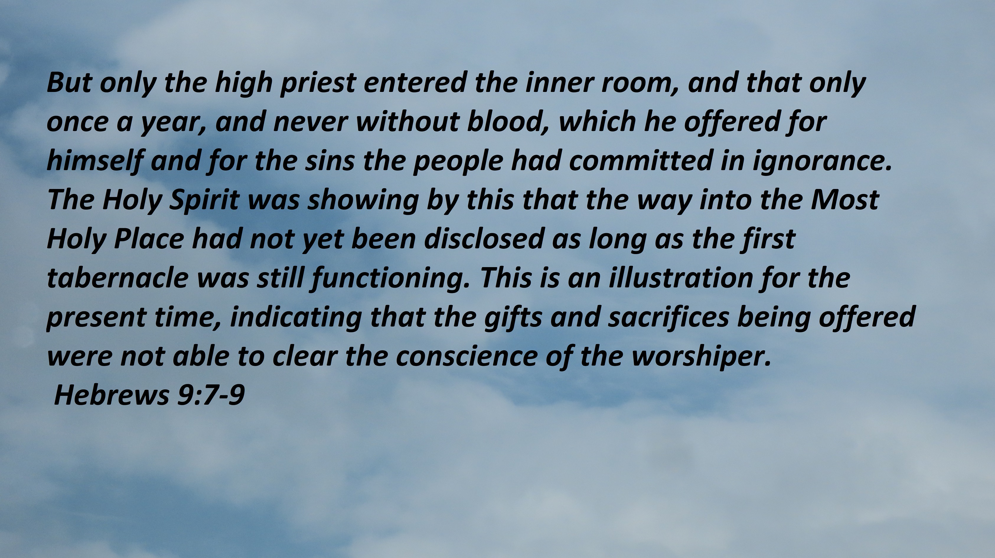 But only the high priest entered the inner room, and that only once a year, and never without blood, which he offered for himself and for the sins the people had committed in ignorance. The Holy Spirit was showing by this that the way into the Most Holy Place had not yet been disclosed as long as the first tabernacle was still functioning. This is an illustration for the present time, indicating that the gifts and sacrifices being offered were not able to clear the conscience of the worshiper.