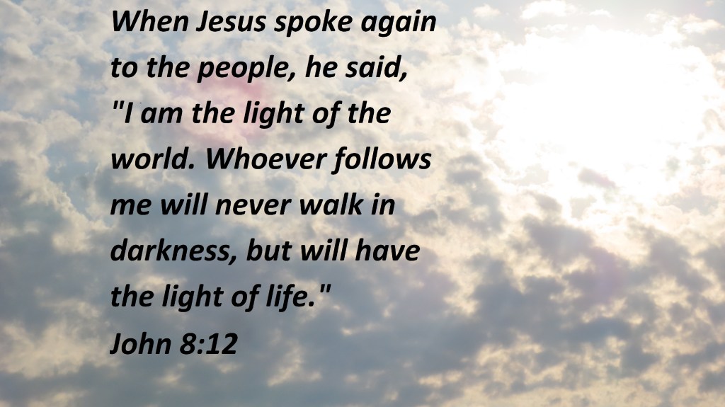 Uncategorized “Walk In The Light” Date: June 21, 2021Author: © Christian National Church of Christ 0 Comments When Jesus spoke again to the people, he said, “I am the light of the world. Whoever follows me will never walk in darkness, but will have the light of life.” John 8:12 Share this: Share on X (Opens in new window) X Share on Facebook (Opens in new window) Facebook Like Loading... Related