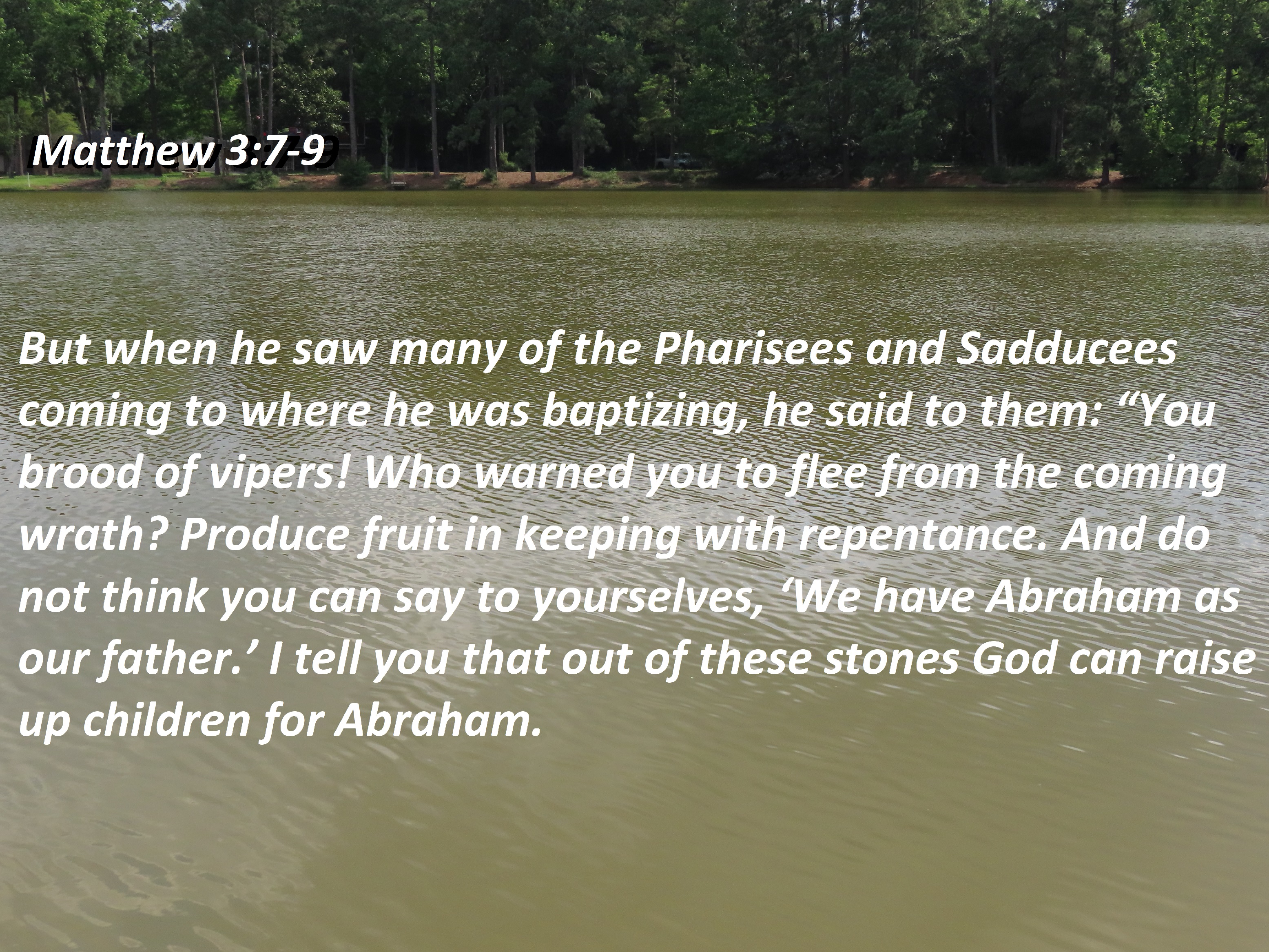 But when he saw many of the Pharisees and Sadducees coming to where he was baptizing, he said to them: “You brood of vipers! Who warned you to flee from the coming wrath? Produce fruit in keeping with repentance. And do not think you can say to yourselves, ‘We have Abraham as our father.’ I tell you that out of these stones God can raise up children for Abraham.