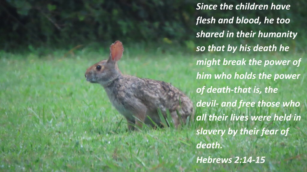 Since the children have flesh and blood, he too shared in their humanity so that by his death he might break the power of him who holds the power of death-that is, the devil- and free those who all their lives were held in slavery by their fear of death.