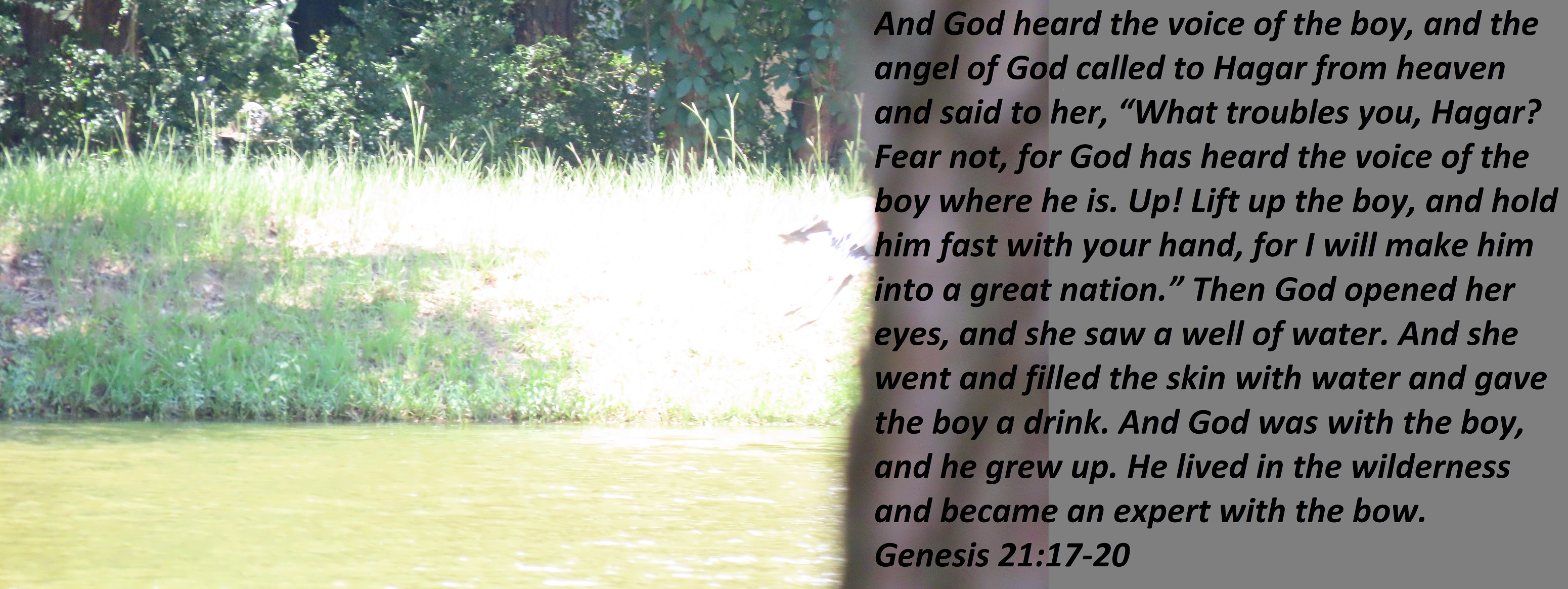 And God heard the voice of the boy, and the angel of God called to Hagar from heaven and said to her, “What troubles you, Hagar? Fear not, for God has heard the voice of the boy where he is. Up! Lift up the boy, and hold him fast with your hand, for I will make him into a great nation.” Then God opened her eyes, and she saw a well of water. And she went and filled the skin with water and gave the boy a drink. And God was with the boy, and he grew up. He lived in the wilderness and became an expert with the bow.