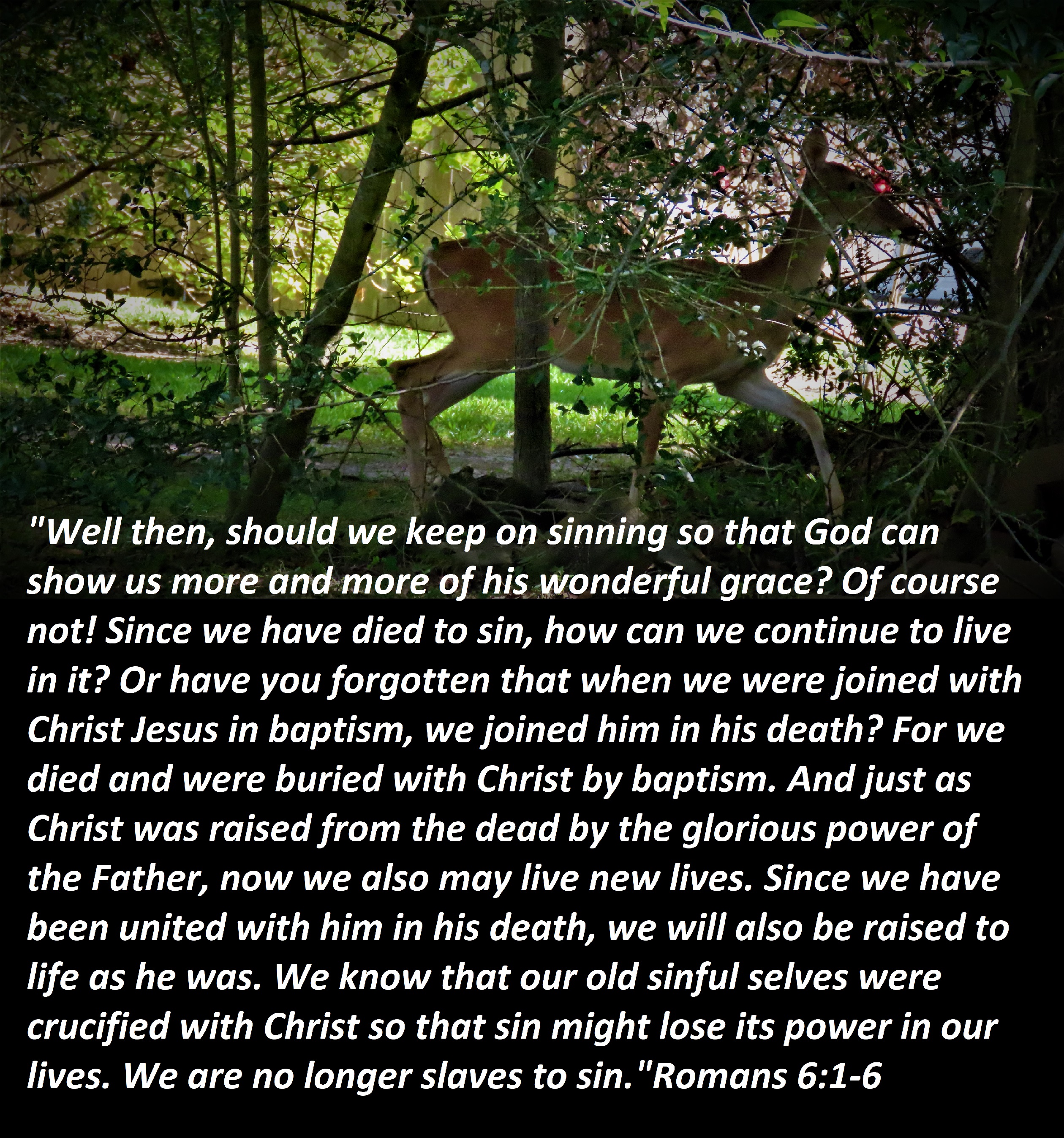 “Well then, should we keep on sinning so that God can show us more and more of his wonderful grace? Of course not! Since we have died to sin, how can we continue to live in it? Or have you forgotten that when we were joined with Christ Jesus in baptism, we joined him in his death? For we died and were buried with Christ by baptism. And just as Christ was raised from the dead by the glorious power of the Father, now we also may live new lives. Since we have been united with him in his death, we will also be raised to life as he was. We know that our old sinful selves were crucified with Christ so that sin might lose its power in our lives. We are no longer slaves to sin.”