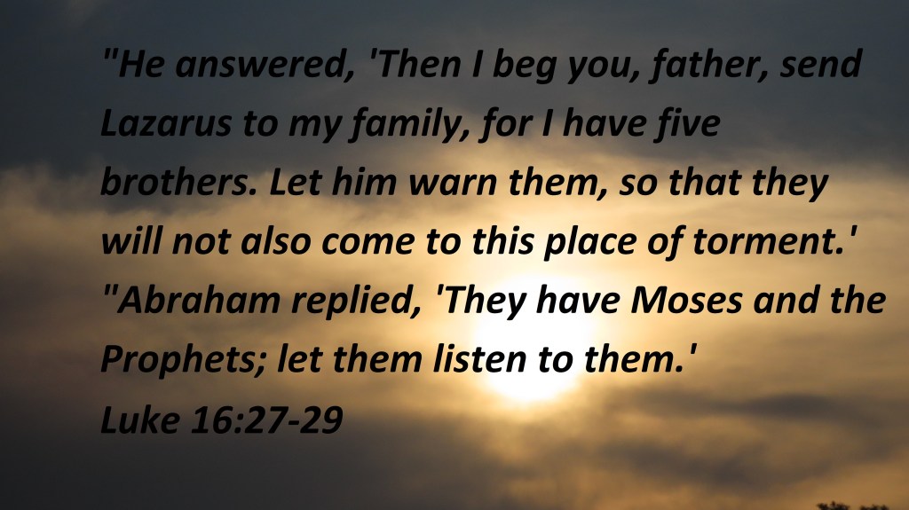 “He answered, ‘Then I beg you, father, send Lazarus to my family, for I have five brothers. Let him warn them, so that they will not also come to this place of torment.’ “Abraham replied, ‘They have Moses and the Prophets; let them listen to them.’