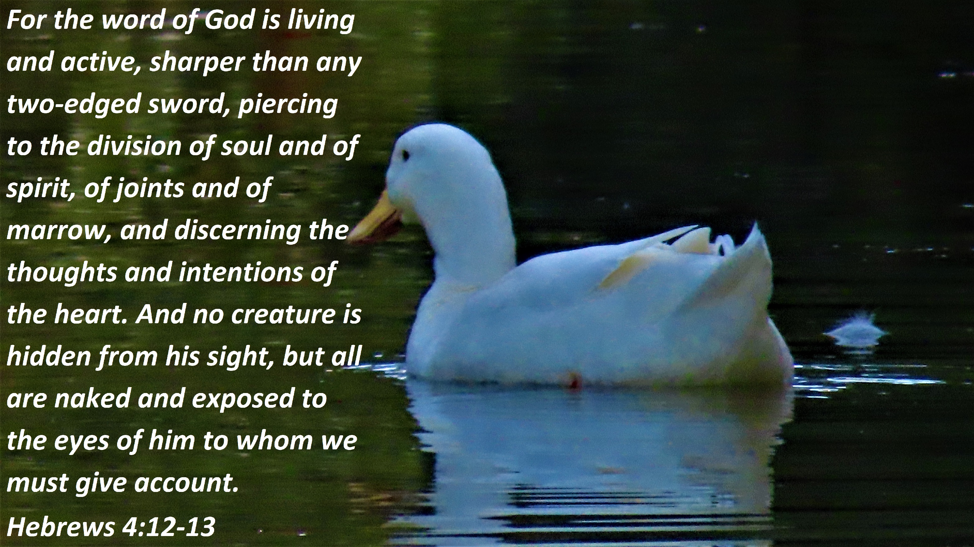 For the word of God is living and active, sharper than any two-edged sword, piercing to the division of soul and of spirit, of joints and of marrow, and discerning the thoughts and intentions of the heart. And no creature is hidden from his sight, but all are naked and exposed to the eyes of him to whom we must give account. Hebrews 4:12-13