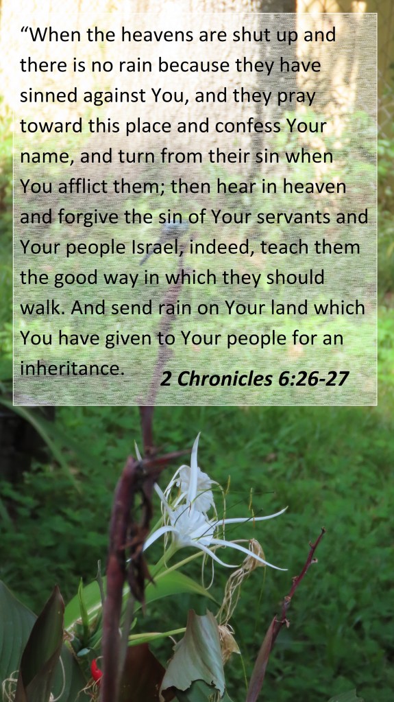 “When the heavens are shut up and there is no rain because they have sinned against You, and they pray toward this place and confess Your name, and turn from their sin when You afflict them; then hear in heaven and forgive the sin of Your servants and Your people Israel, indeed, teach them the good way in which they should walk. And send rain on Your land which You have given to Your people for an inheritance.
