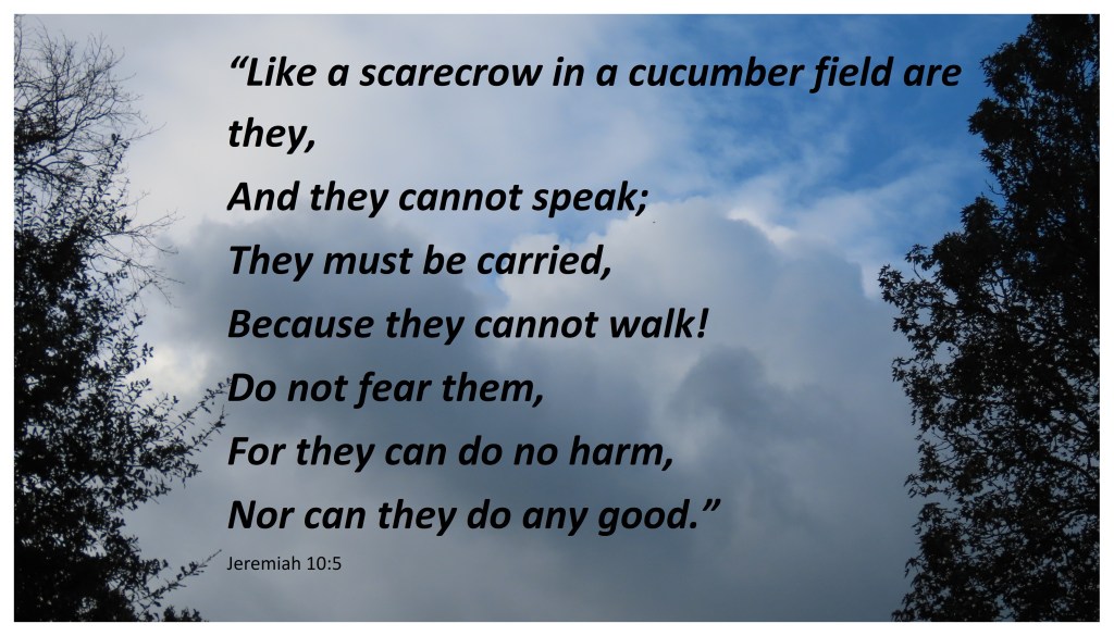 Uncategorized “Idol’s” Date: September 19, 2021Author: © Christian National Church of Christ 0 Comments “Like a scarecrow in a cucumber field are they,And they cannot speak;They must be carried,Because they cannot walk!Do not fear them,For they can do no harm,Nor can they do any good.” Jeremiah 10:5 Share this: Click to share on X (Opens in new window) X Click to share on Facebook (Opens in new window) Facebook Like Loading... Related