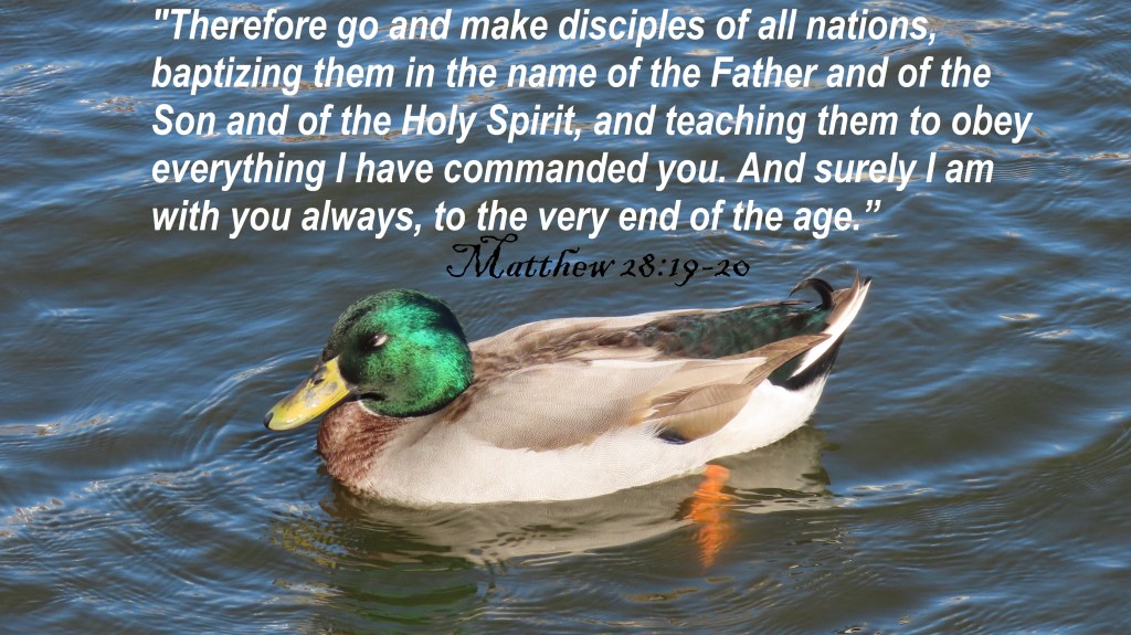 “Therefore go and make disciples of all nations, baptizing them in the name of the Father and of the Son and of the Holy Spirit, and teaching them to obey everything I have commanded you. And surely I am with you always, to the very end of the age.” Matthew 28:19-20