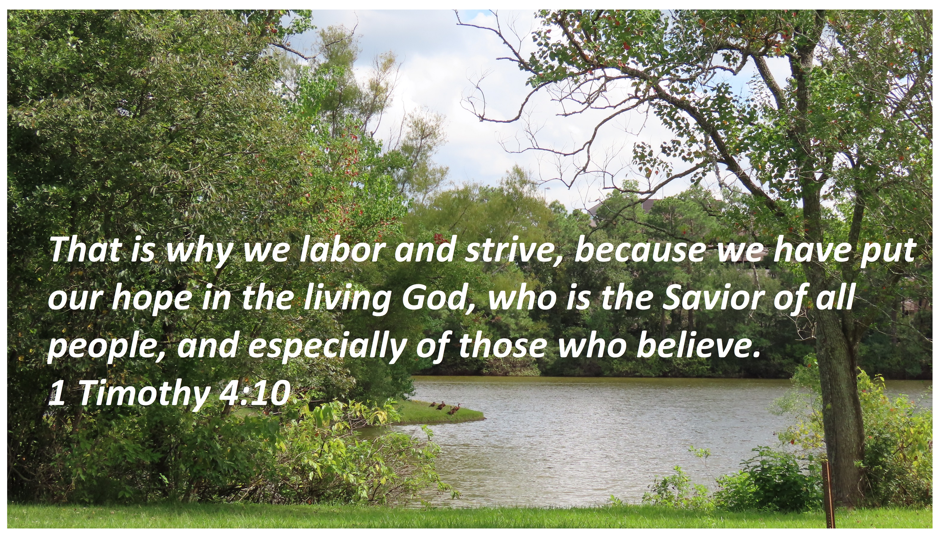 Uncategorized “Our Hope Is In God” Date: October 24, 2021Author: © Christian National Church of Christ 0 Comments That is why we labor and strive, because we have put our hope in the living God, who is the Savior of all people, and especially of those who believe.1 Timothy 4:10 Share this: Share on X (Opens in new window) X Share on Facebook (Opens in new window) Facebook Like Loading... Related