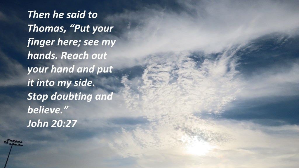 Uncategorized “Just Believe” Date: October 29, 2021Author: © Christian National Church of Christ 0 Comments Then he said to Thomas, “Put your finger here; see my hands. Reach out your hand and put it into my side. Stop doubting and believe.” John 20:27 Share this: Share on X (Opens in new window) X Share on Facebook (Opens in new window) Facebook Like Loading... Related