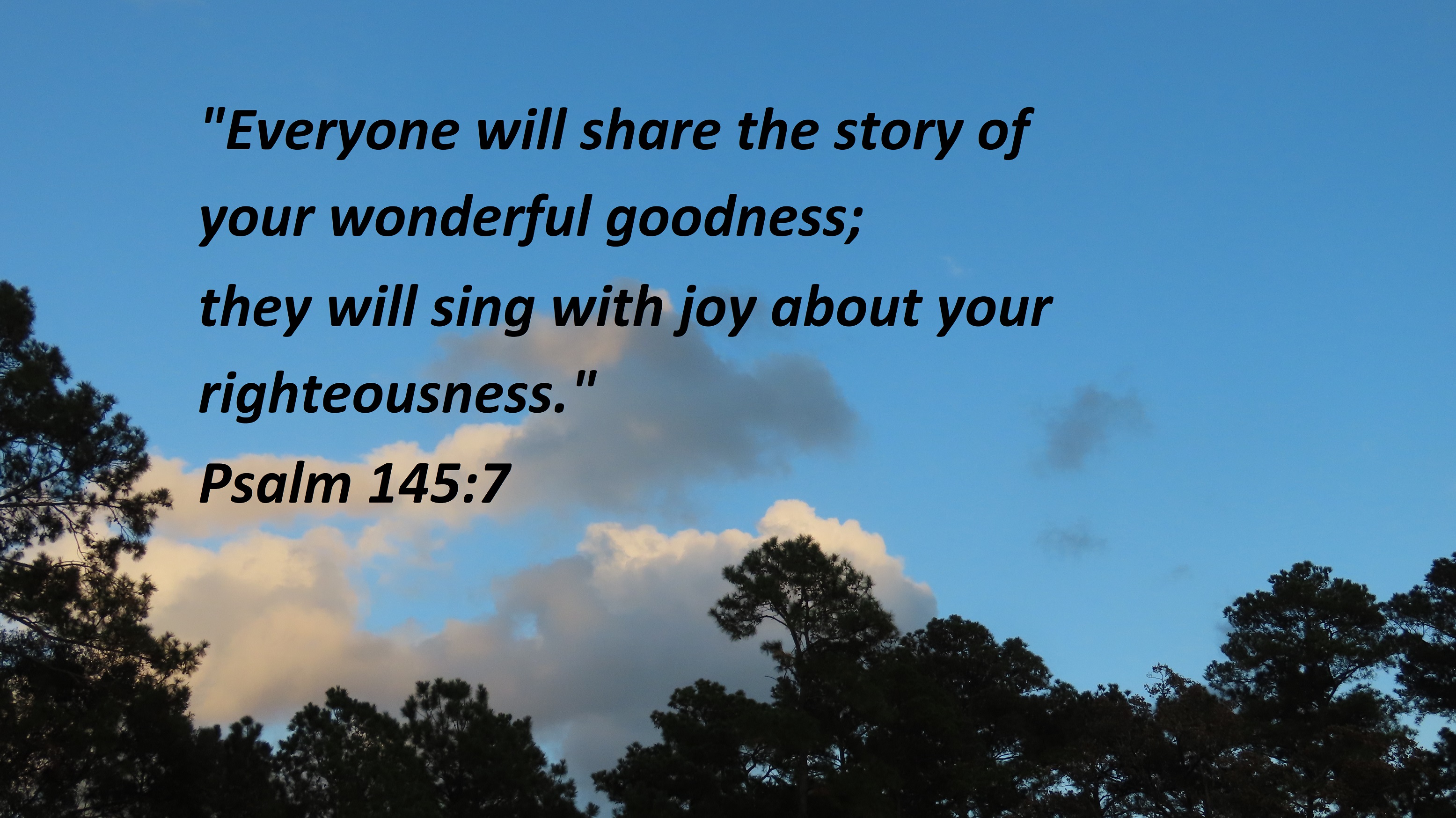 Uncategorized “Thanksgiving” Date: November 24, 2021Author: © Christian National Church of Christ 0 Comments “Everyone will share the story of your wonderful goodness;they will sing with joy about your righteousness.”Psalm 145:7 Share this: Share on X (Opens in new window) X Share on Facebook (Opens in new window) Facebook Like Loading... Related