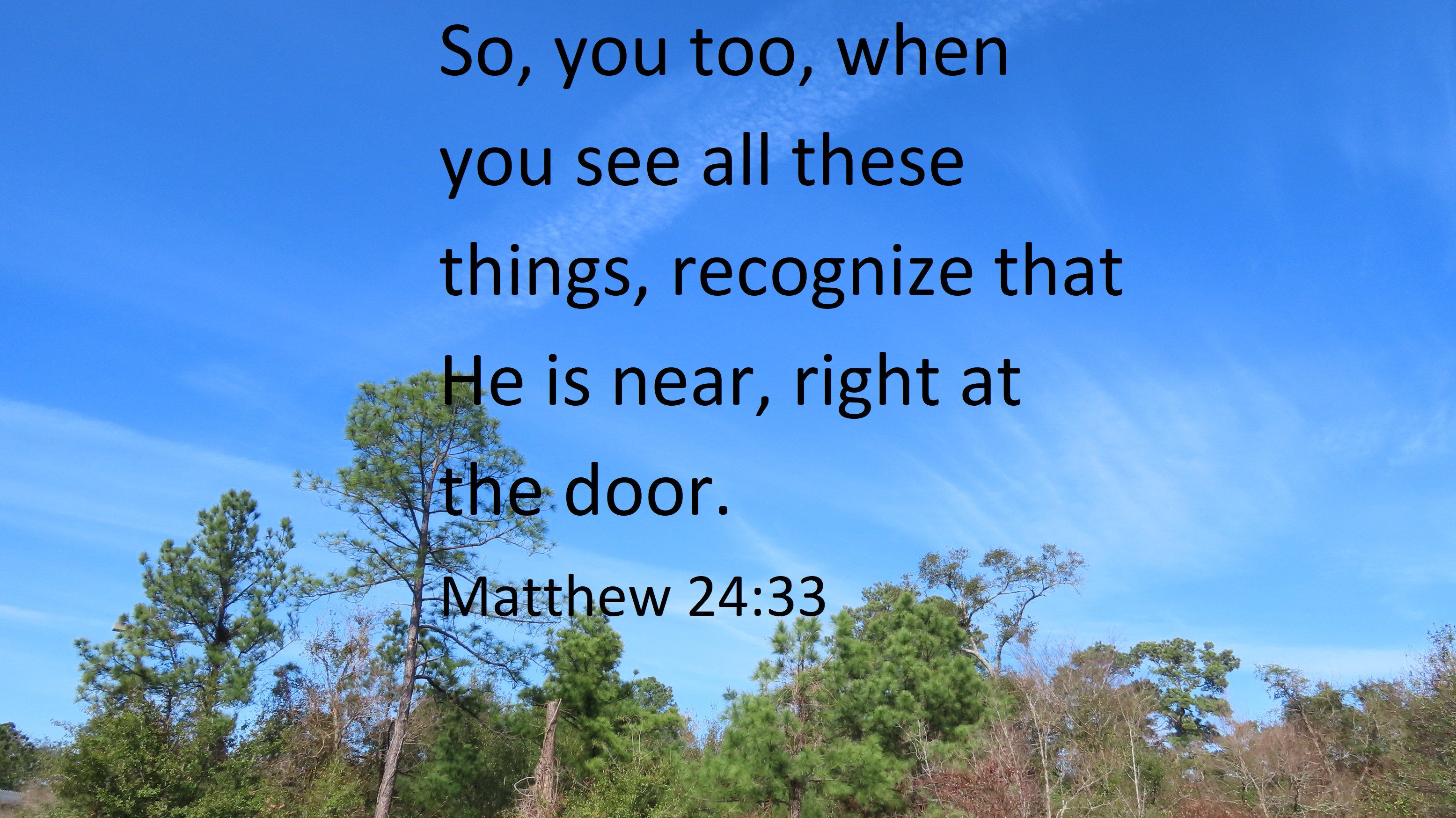 Uncategorized “Jesus Is Nearby” Date: January 7, 2022Author: © Christian National Church of Christ 0 Comments So, you too, when you see all these things, recognize that He is near, right at the door.Matthew 24:33 Share this: Share on X (Opens in new window) X Share on Facebook (Opens in new window) Facebook Like Loading... Related
