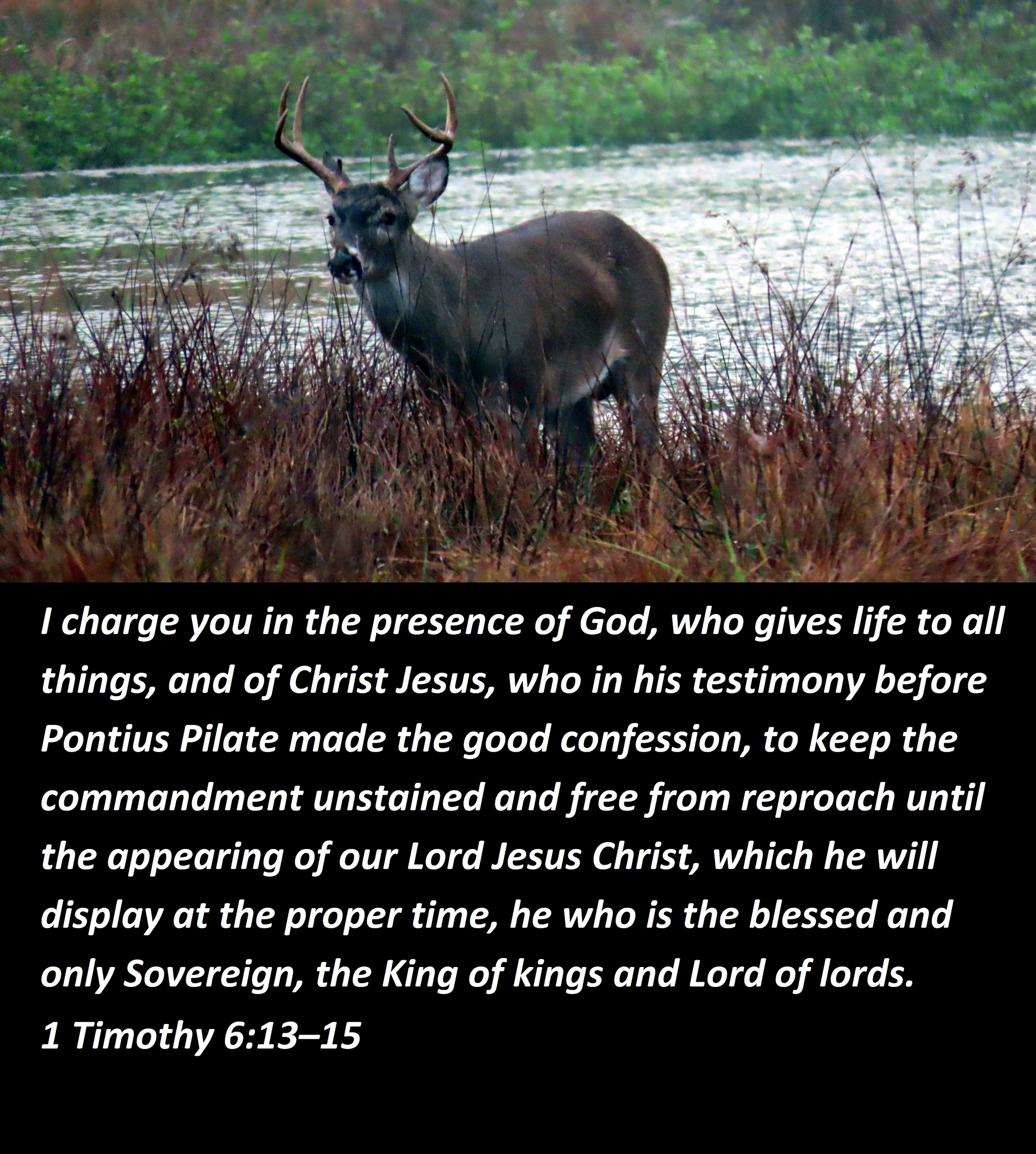 I charge you in the presence of God, who gives life to all things, and of Christ Jesus, who in his testimony before Pontius Pilate made the good confession, to keep the commandment unstained and free from reproach until the appearing of our Lord Jesus Christ, which he will display at the proper time, he who is the blessed and only Sovereign, the King of kings and Lord of lords.