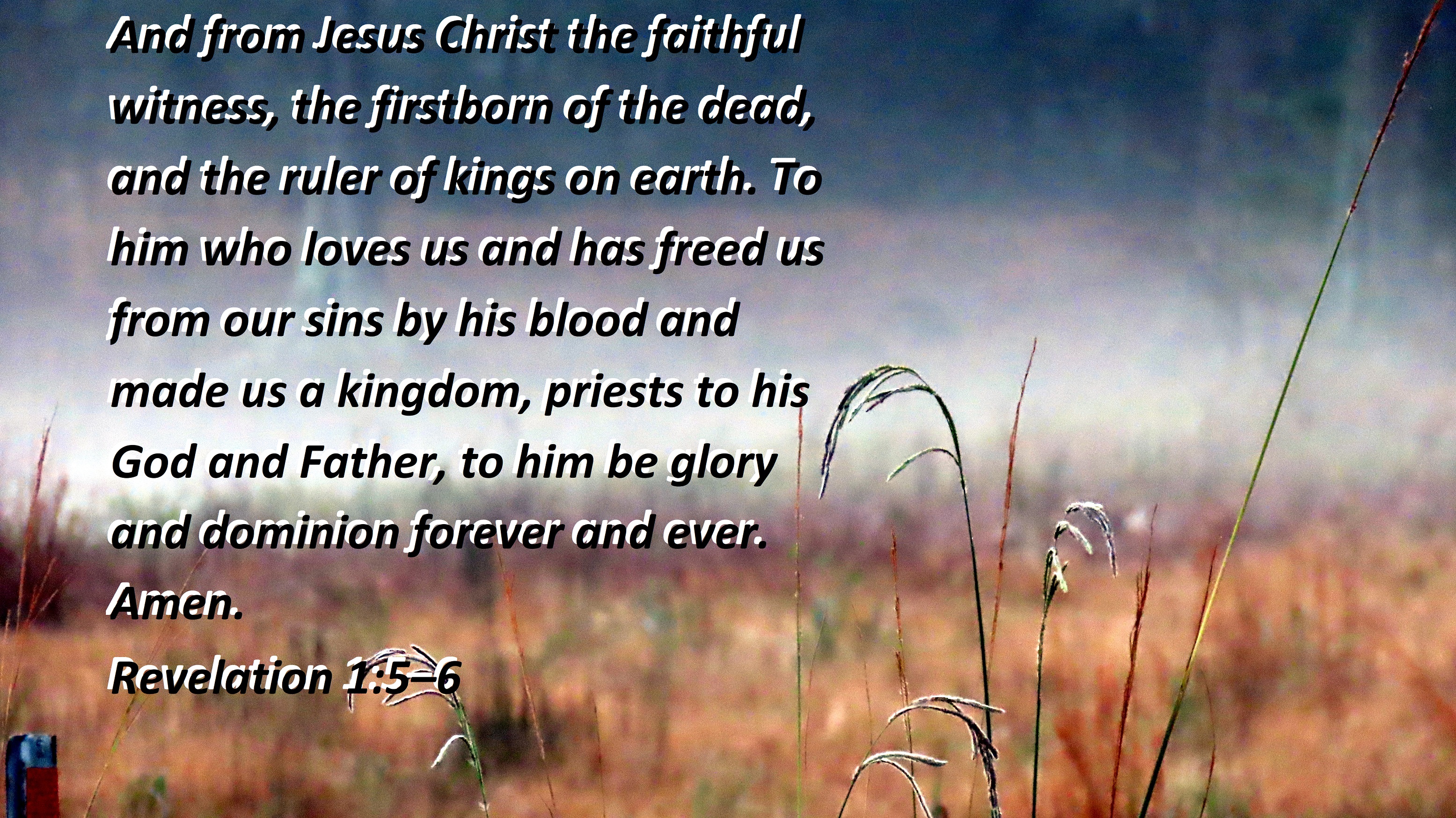 And from Jesus Christ the faithful witness, the firstborn of the dead, and the ruler of kings on earth. To him who loves us and has freed us from our sins by his blood and made us a kingdom, priests to his God and Father, to him be glory and dominion forever and ever. Amen.