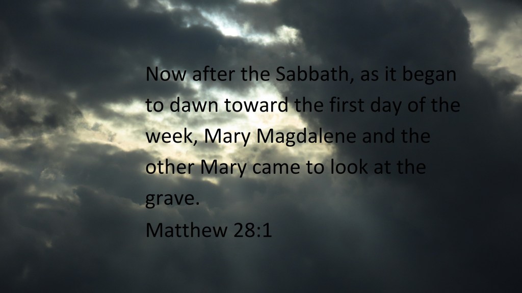 Uncategorized “God Bless’s” Date: March 23, 2022Author: © Christian National Church of Christ 0 Comments Now after the Sabbath, as it began to dawn toward the first day of the week, Mary Magdalene and the other Mary came to look at the grave.Matthew 28:1 Share this: Share on X (Opens in new window) X Share on Facebook (Opens in new window) Facebook Like Loading... Related
