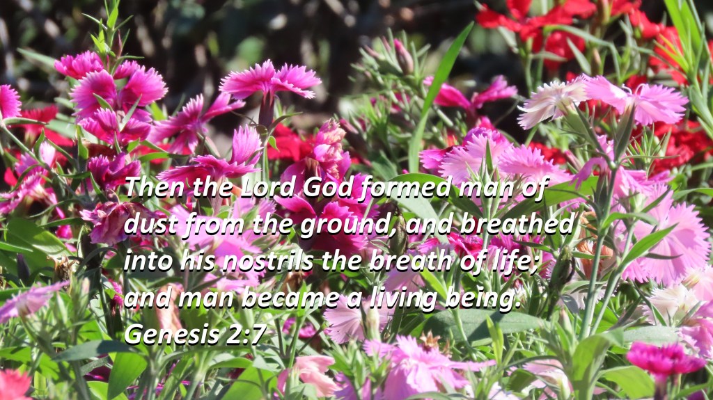 Uncategorized “God Gives Life” Date: March 28, 2022Author: © Christian National Church of Christ 0 Comments Then the Lord God formed man of dust from the ground and breathed into his nostrils the breath of life; and man became a living being. Genesis 2:7 Share this: Share on X (Opens in new window) X Share on Facebook (Opens in new window) Facebook Like Loading... Related