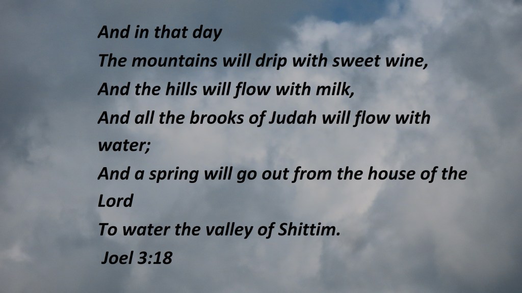 Uncategorized “Mountain Of Blessings” Date: May 20, 2022Author: © Christian National Church of Christ 0 Comments And in that dayThe mountains will drip with sweet wine,And the hills will flow with milk,And all the brooks of Judah will flow with water.And a spring will go out from the house of the LordTo water the valley of Shittim. Joel 3:18 Share this: Share on X (Opens in new window) X Share on Facebook (Opens in new window) Facebook Like Loading... Related