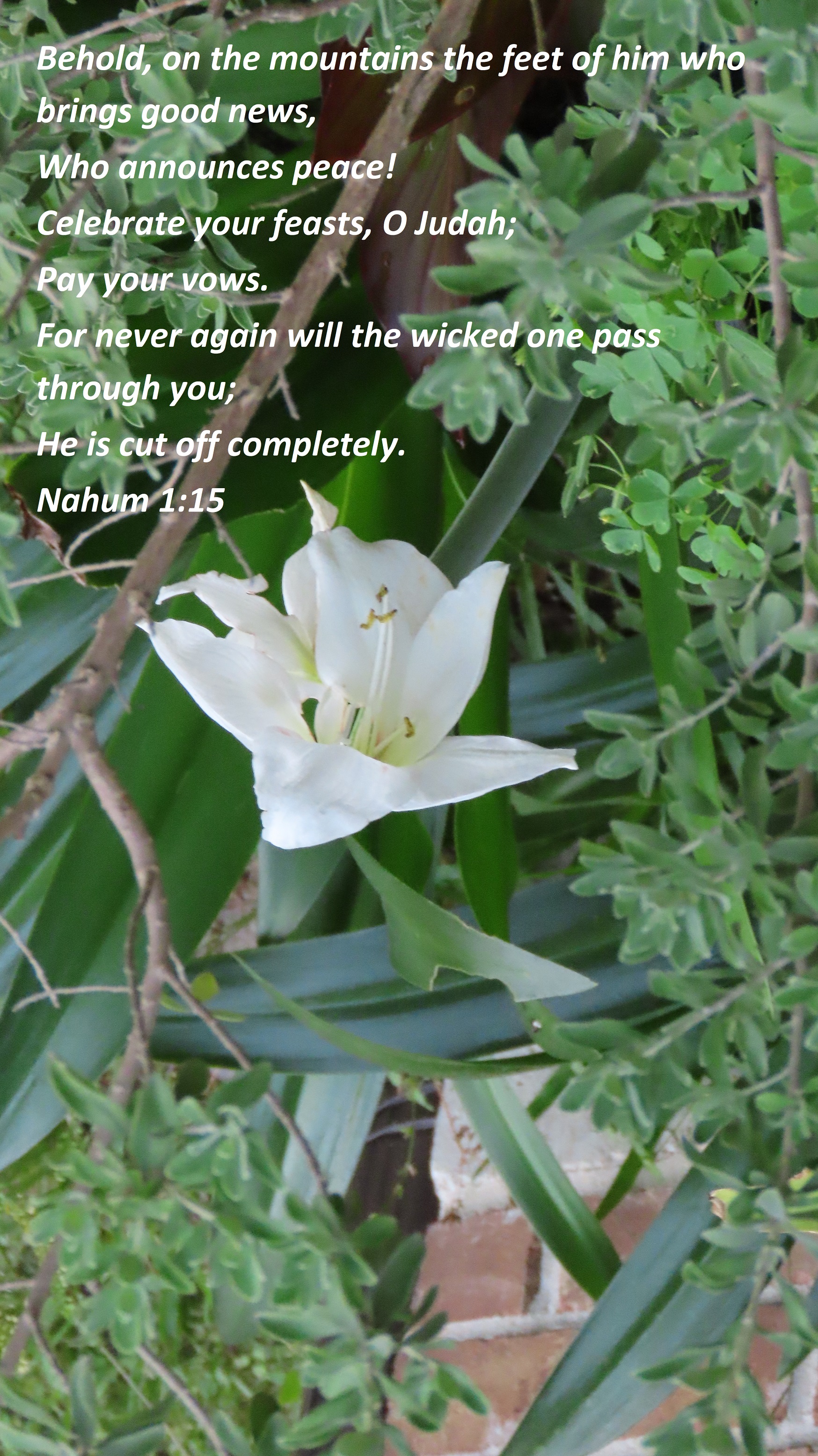 Uncategorized “Mountains Of Blessings” Date: May 22, 2022Author: © Christian National Church of Christ 0 Comments Behold, on the mountains the feet of him who brings good news,Who announces peace!Celebrate your feasts, O Judah.Pay your vows.For never again will the wicked one pass through you.He is cut off completely. Nahum 1:15 Share this: Share on X (Opens in new window) X Share on Facebook (Opens in new window) Facebook Like Loading... Related