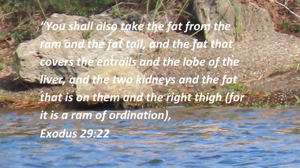 Uncategorized “Peace Offering” Date: June 11, 2022Author: © Christian National Church of Christ 0 Comments “You shall also take the fat from the ram and the fat tail, and the fat that covers the entrails and the lobe of the liver, and the two kidneys and the fat that is on them and the right thigh (for it is a ram of ordination),Exodus 29:22 Share this: Share on X (Opens in new window) X Share on Facebook (Opens in new window) Facebook Like Loading... Related