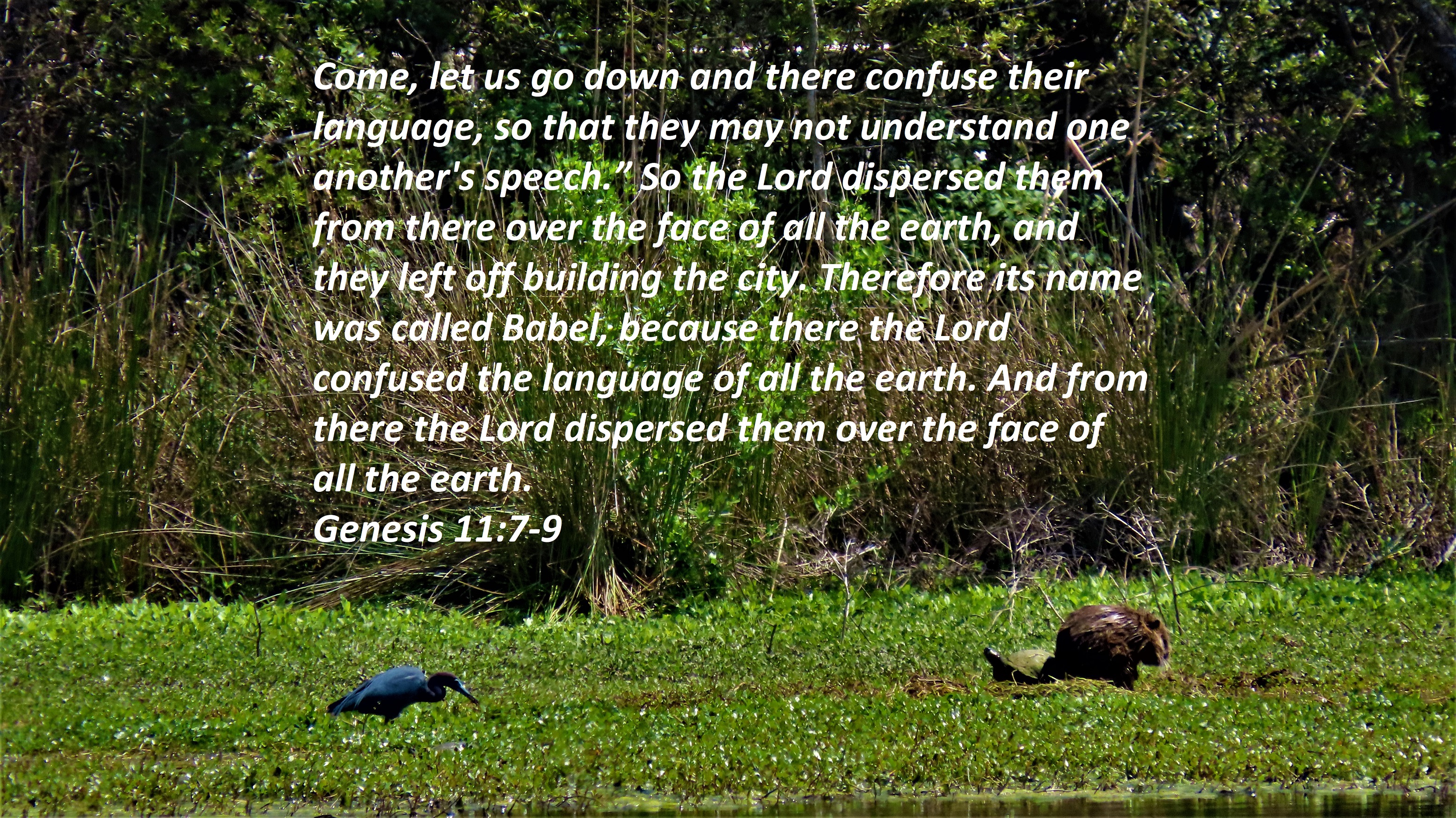 Come, let us go down and there confuse their language, so that they may not understand one another’s speech.” So, the Lord dispersed them from there over the face of all the earth, and they left off building the city. Therefore, its name was called Babel, because there the Lord confused the language of all the earth. And from there the Lord dispersed them over the face of all the earth.