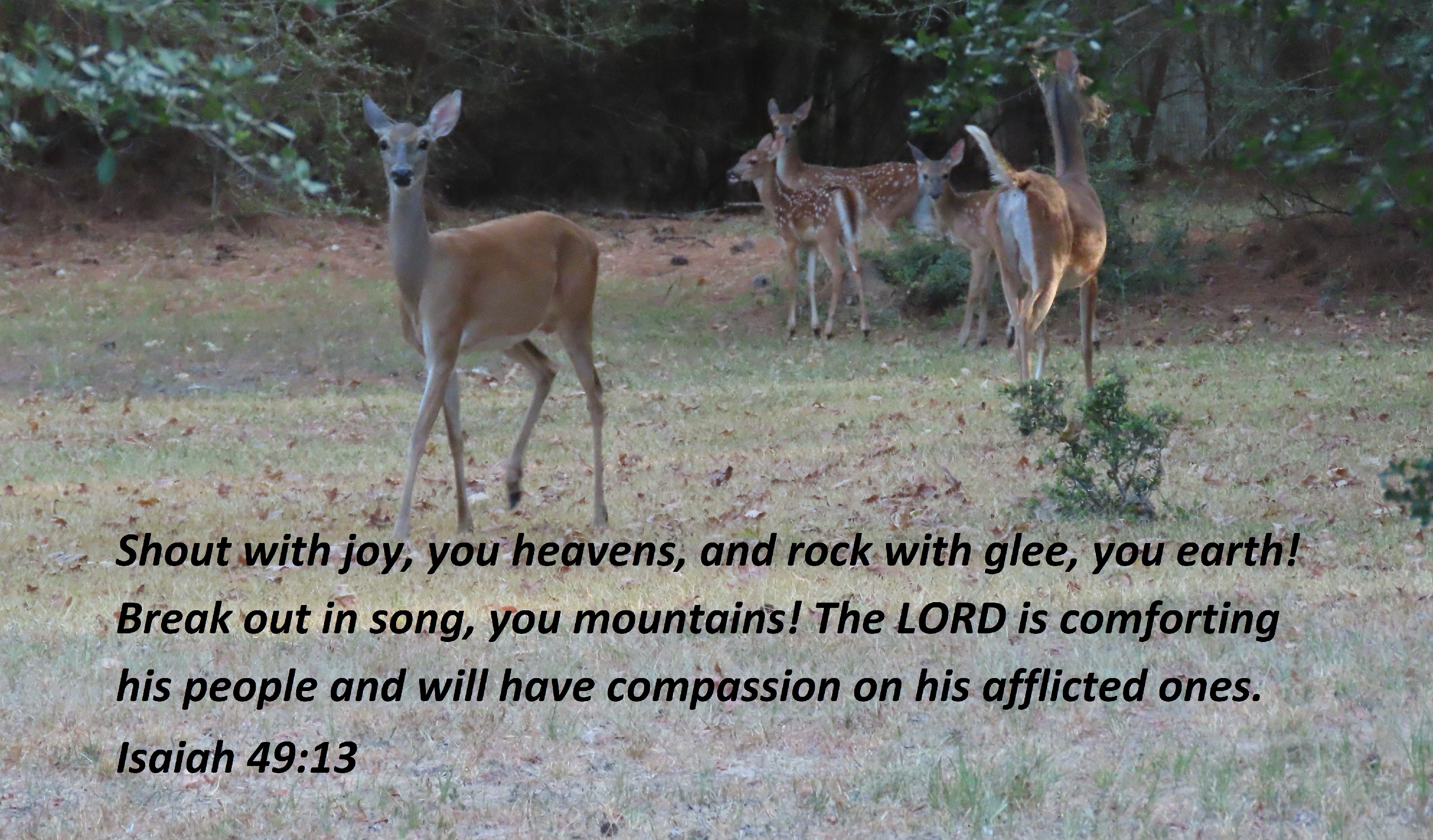 Uncategorized “Sing With Great Delight” Date: July 13, 2022Author: © Christian National Church of Christ 0 Comments Shout with joy, you heavens, and rock with glee, you earth! Break out in song, you mountains! The LORD is comforting his people and will have compassion on his afflicted ones. Isaiah 49:13 Share this: Share on X (Opens in new window) X Share on Facebook (Opens in new window) Facebook Like Loading... Related