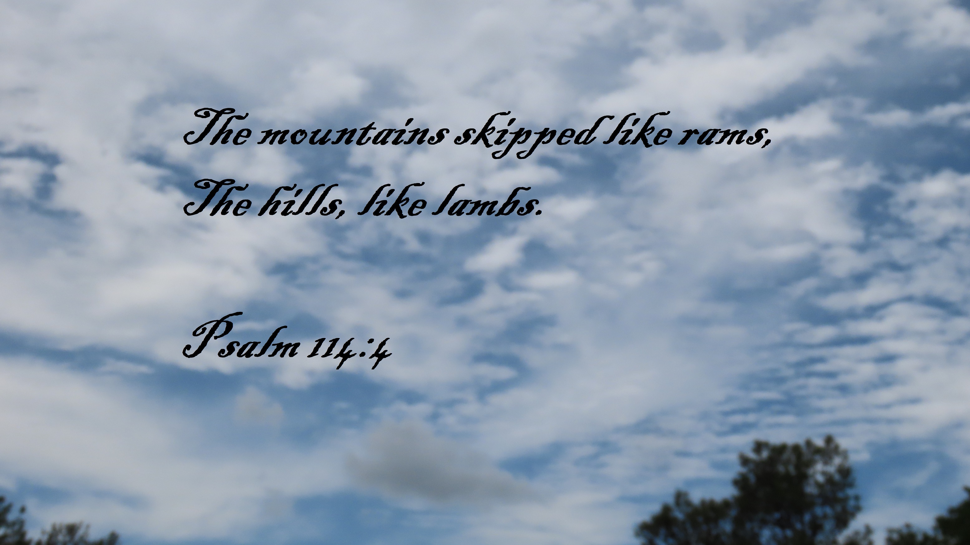 Uncategorized “Leaping For Joy” Date: August 2, 2022Author: © Christian National Church of Christ 0 Comments The mountains skipped like rams,The hills, like lambs. Psalm 114:4 Share this: Share on X (Opens in new window) X Share on Facebook (Opens in new window) Facebook Like Loading... Related