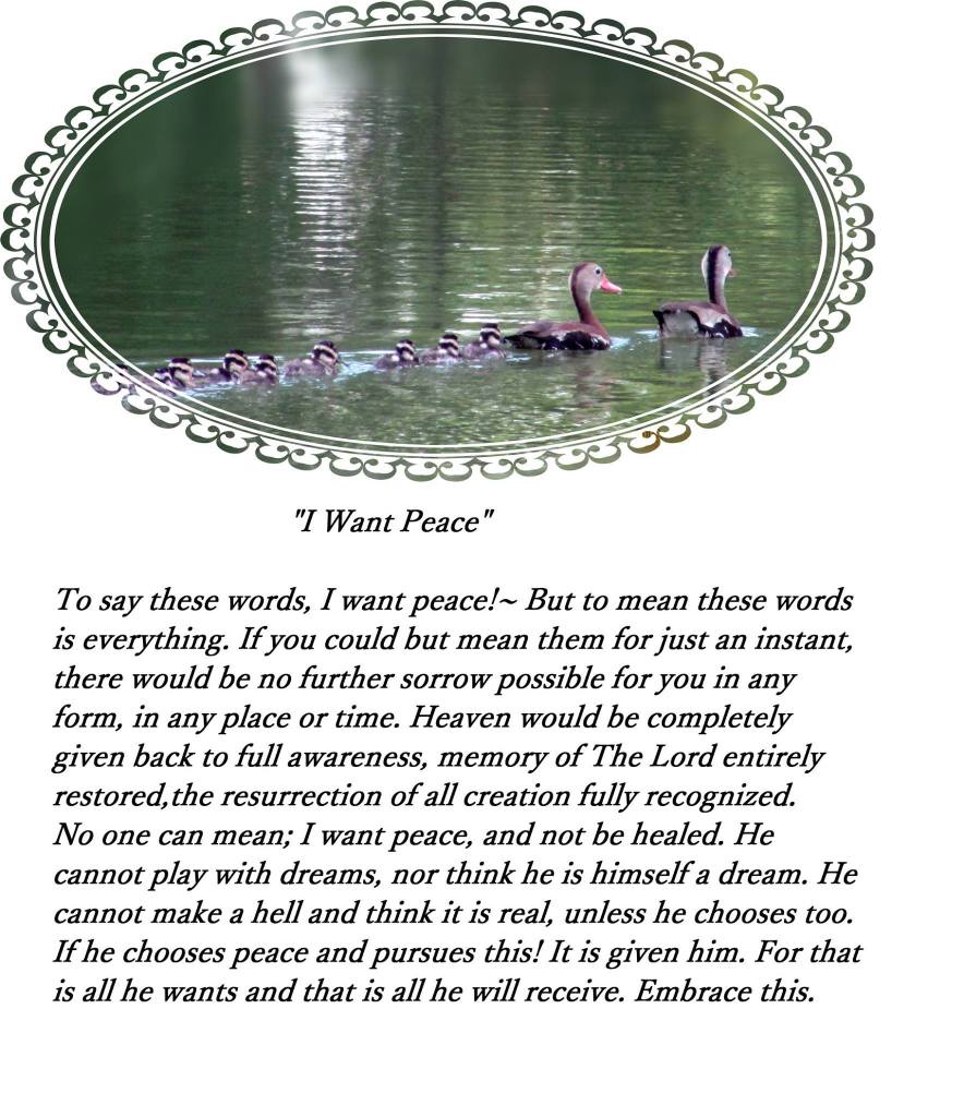 To say these words, I want peace!~ But to mean these words is everything. If you could but mean them for just an instant, there would be no further sorrow possible for you in any form, in any place or time. Heaven would be completely given back to full awareness, memory of The Lord entirely restored, the resurrection of all creation fully recognized.