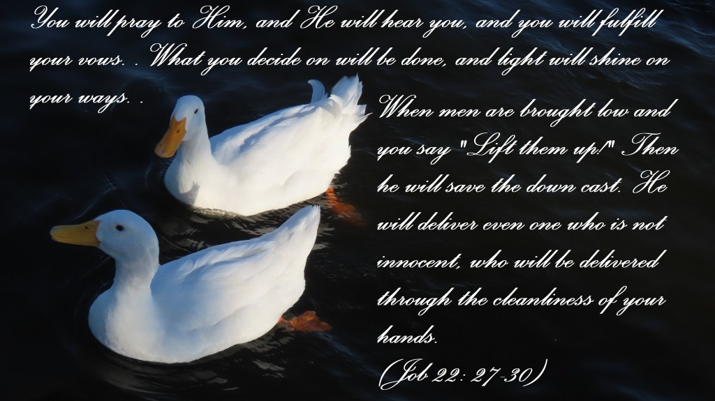 You will pray to Him, and He will hear you, and you will fulfill your vows. . What you decide on will be done, and light will shine on your ways. . When men are brought low and you say “Lift them up!” Then he will save the down cast. He will deliver even one who is not innocent, who will be delivered through the cleanliness of your hands.