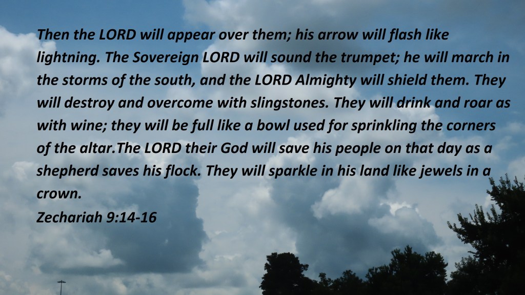 Then the LORD will appear over them; his arrow will flash like lightning. The Sovereign LORD will sound the trumpet; he will march in the storms of the south, and the LORD Almighty will shield them. They will destroy and overcome with slingstones. They will drink and roar as with wine; they will be full like a bowl used for sprinkling the corners of the altar. The LORD their God will save his people on that day as a shepherd saves his flock. They will sparkle in his land like jewels in a crown.