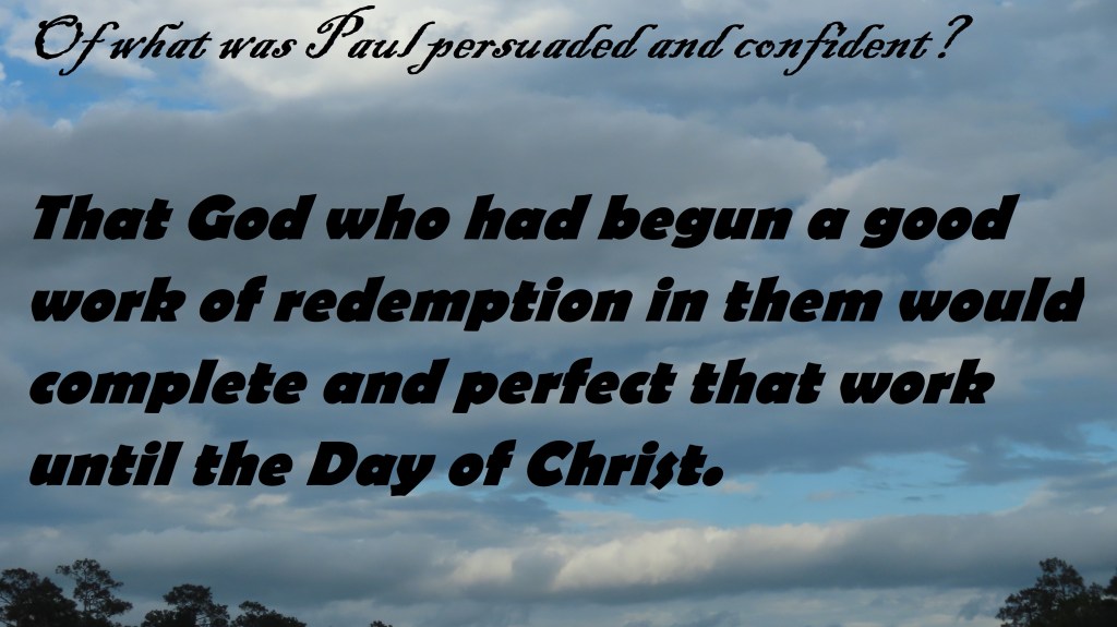 Uncategorized “Philippians Chapter One” Date: October 2, 2022Author: © Christian National Church of Christ 0 Comments Of what was Paul persuaded and confident? That God who had begun a good work of redemption in them would complete and perfect that work until the Day of Christ. v6 Share this: Share on X (Opens in new window) X Share on Facebook (Opens in new window) Facebook Like Loading... Related
