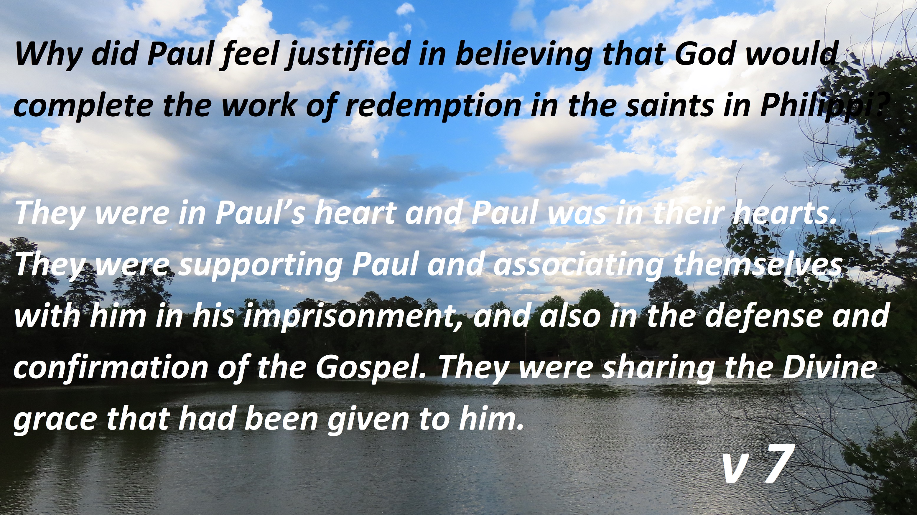 They were in Paul’s heart and Paul was in their hearts. They were supporting Paul and associating themselves with him in his imprisonment, and also in the defense and confirmation of the Gospel. They were sharing the Divine grace that had been given to him. v7