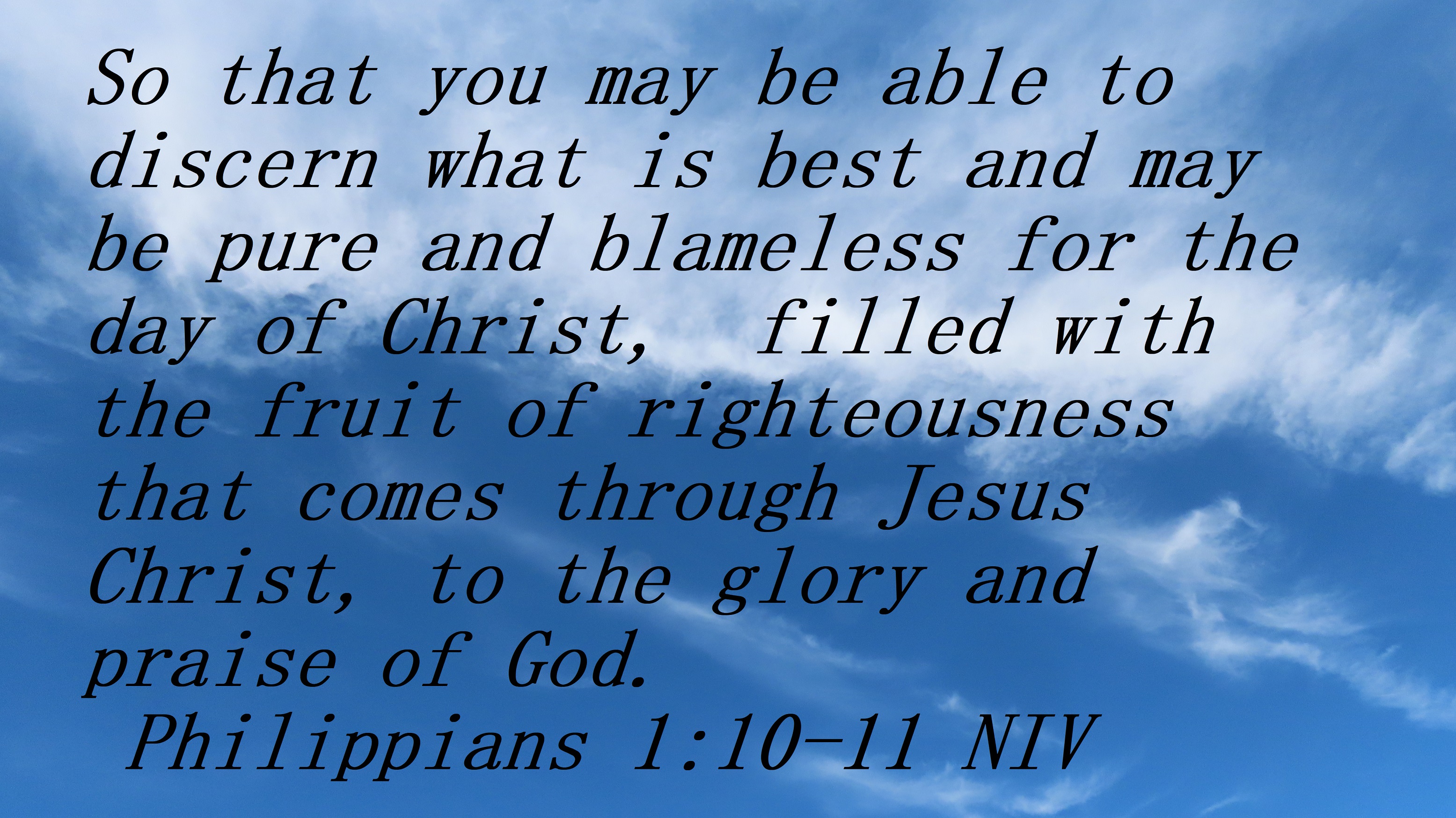 So that you may be able to discern what is best and may be pure and blameless for the day of Christ, filled with the fruit of righteousness that comes through Jesus Christ—to the glory and praise of God. Philippians 1:10-11 NIV