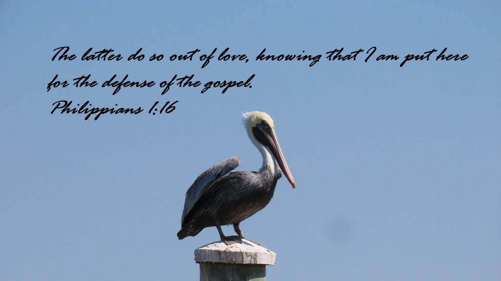 The latter do so out of love, knowing that I am put here for the defense of the gospel. Philippians 1:16