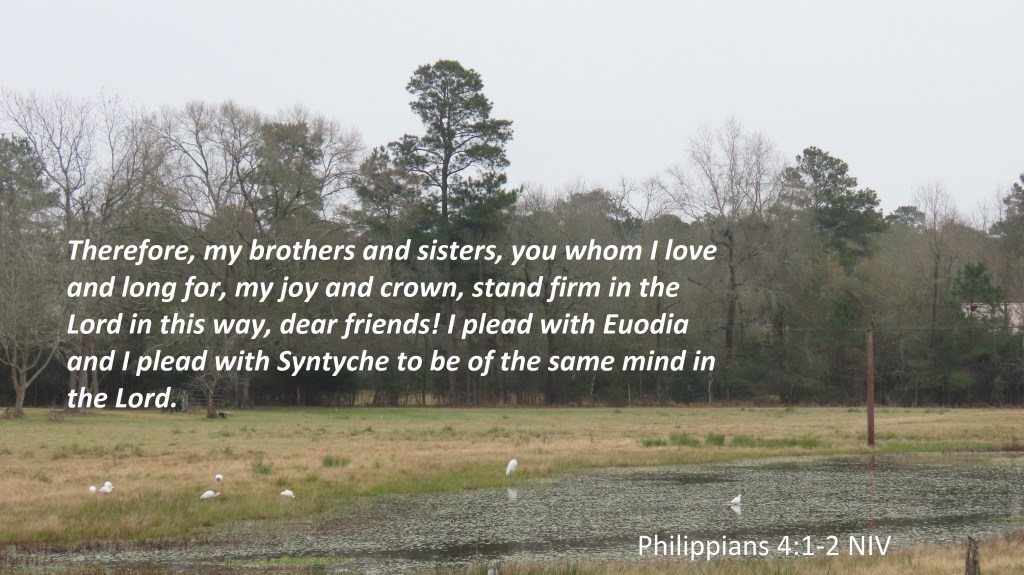 It reads in Philippians 4:1-2 NIV, Therefore, my brothers and sisters, you whom I love and long for, my joy and crown, stand firm in the Lord in this way, dear friends! I plead with Euodia and I plead with Syntyche to be of the same mind in the Lord.