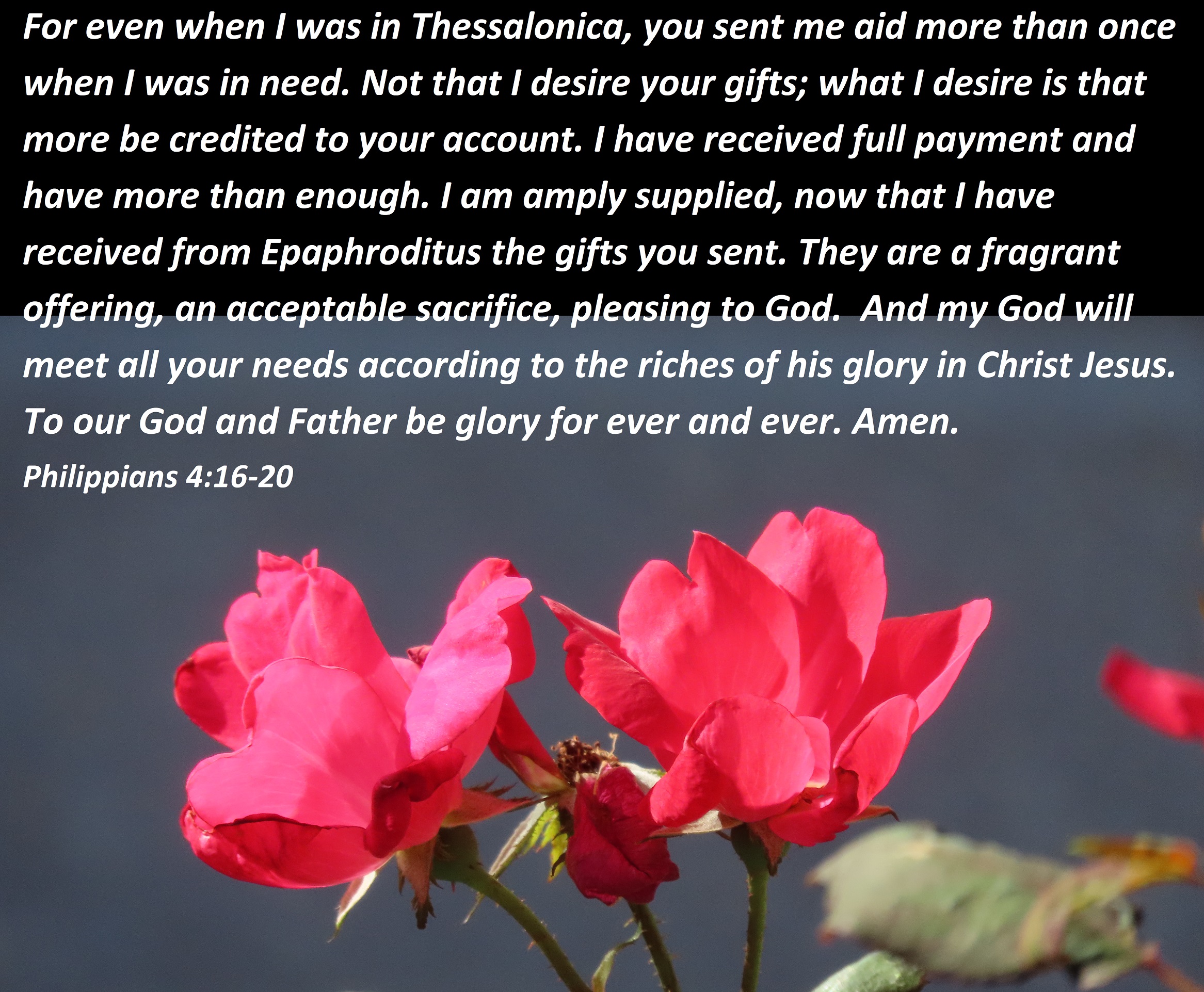 For even when I was in Thessalonica, you sent me aid more than once when I was in need. Not that I desire your gifts; what I desire is that more be credited to your account. I have received full payment and have more than enough. I am amply supplied, now that I have received from Epaphroditus the gifts you sent. They are a fragrant offering, an acceptable sacrifice, pleasing to God. And my God will meet all your needs according to the riches of his glory in Christ Jesus. To our God and Father be glory for ever and ever. Amen.