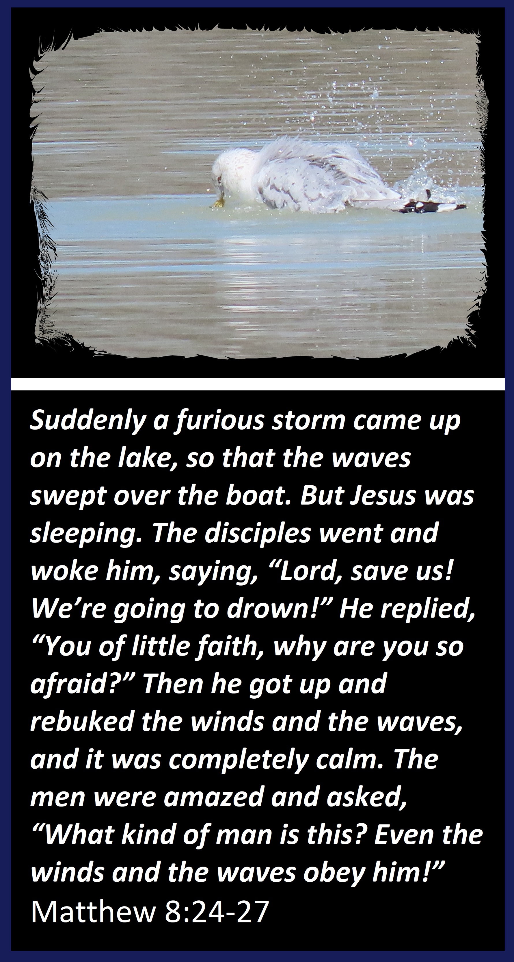 It reads in Matthew 8:24-27: Suddenly a furious storm came up on the lake, so that the waves swept over the boat. But Jesus was sleeping. The disciples went and woke him, saying, “Lord, save us! We’re going to drown!” He replied, “You of little faith, why are you so afraid?” Then he got up and rebuked the winds and the waves, and it was completely calm. The men were amazed and asked, “What kind of man is this? Even the winds and the waves obey him!”