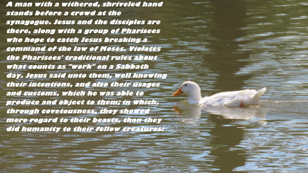 So, if someone A man with a withered, shriveled hand stands before a crowd at the synagogue. Jesus and the disciples are there, along with a group of Pharisees who hope to catch Jesus breaking a command of the law of Moses. Violates the Pharisees’ traditional rules about what counts as “work” on a Sabbath day. Jesus said unto them, well knowing their intentions, and also their usages and customs, which he was able to produce and object to them; in which, through covetousness, they showed more regard to their beasts, than they did humanity to their fellow creatures: But certain types of healing activities were also prohibited, because they involved grinding herbs or other “work” activities not allowed on the Sabbath. Many people had long-term illnesses and simply lived with them through the Sabbath. It appears that even Jesus did not generally heal on the Sabbath. Another reason Jesus healed on the Sabbath was to remind people of why God instituted the Sabbath day of rest. The Sabbath was meant to benefit people as much as to glorify God: “The Sabbath was made for man, not man for the Sabbath” (Mark 2:27, ~ Then Jesus said to them, “The Sabbath day was made for man. Man was not made for the Sabbath day.). The Sabbath helped people recuperate (mentally and physically) after a week of work and redirect their focus from the daily routine to God. Christ poses a series of questions. These show that the Pharisees’ manmade standard for “working” on the Sabbath is faulty. Therefore, their accusation is empty. God’s laws are meant to be followed, but they are also meant to be understood. Just as God’s laws mean more than avoiding only physical sins (Matthew 5:27–28,~ “You have heard that it was said, ‘You shall not commit adultery.’ But I tell you that anyone who looks at a woman lustfully has already committed adultery with her in his heart.), they are also not meant to prevent men from doing good when the situation requires it. Going even further, Jesus declares Himself Lord of the Sabbath (Matthew 12:3–8)