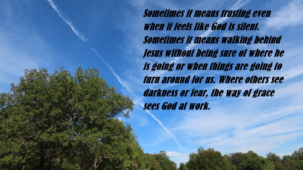 Sometimes it means trusting even when it feels like God is silent. Sometimes it means walking behind Jesus without being sure of where he is going or when things are going to turn around for us. Where others see darkness or fear, the way of grace sees God at work.