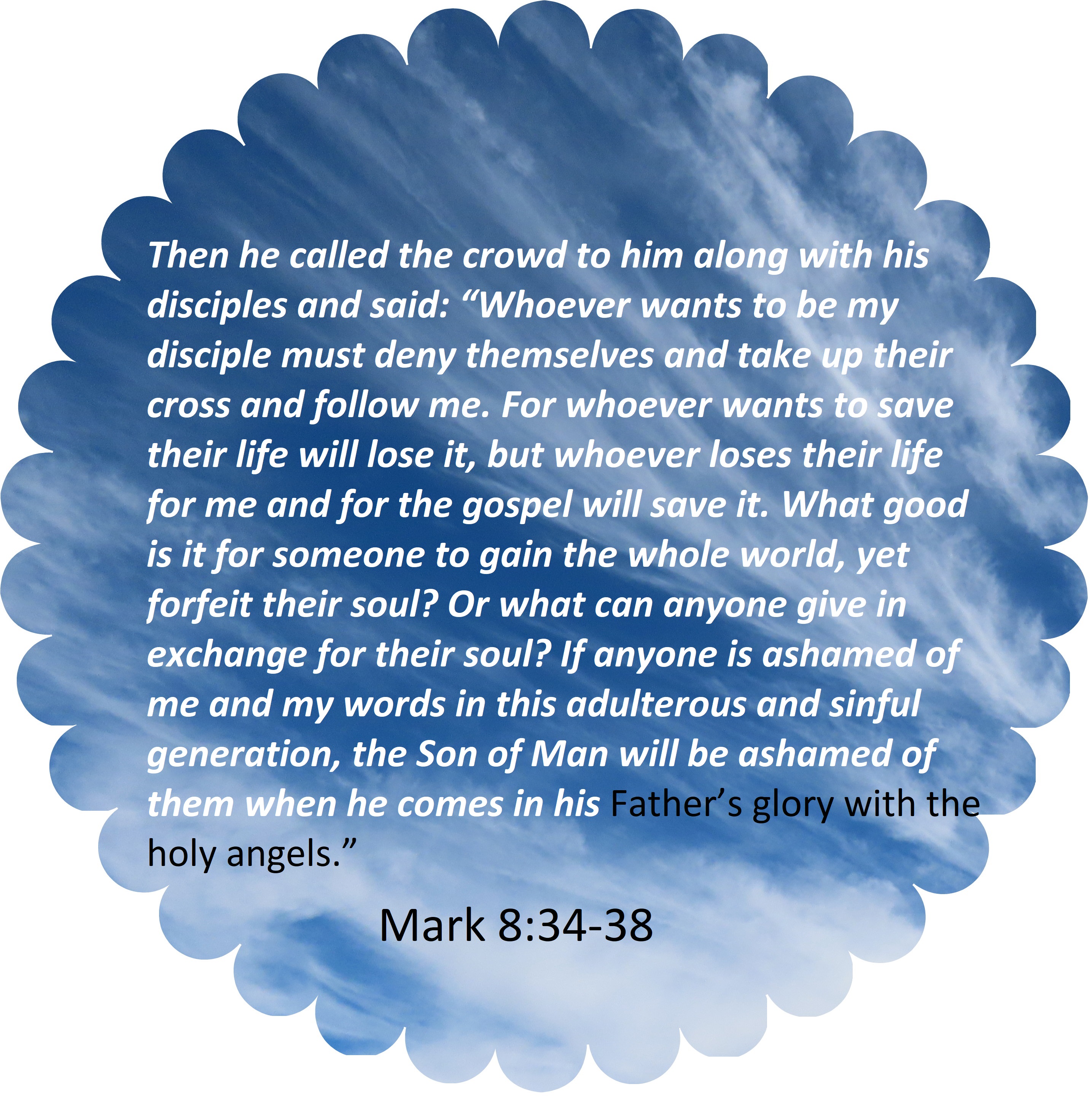 Then he called the crowd to him along with his disciples and said: “Whoever wants to be my disciple must deny themselves and take up their cross and follow me. For whoever wants to save their life will lose it, but whoever loses their life for me and for the gospel will save it. What good is it for someone to gain the whole world, yet forfeit their soul? Or what can anyone give in exchange for their soul? If anyone is ashamed of me and my words in this adulterous and sinful generation, the Son of Man will be ashamed of them when he comes in his Father’s glory with the holy angels.”