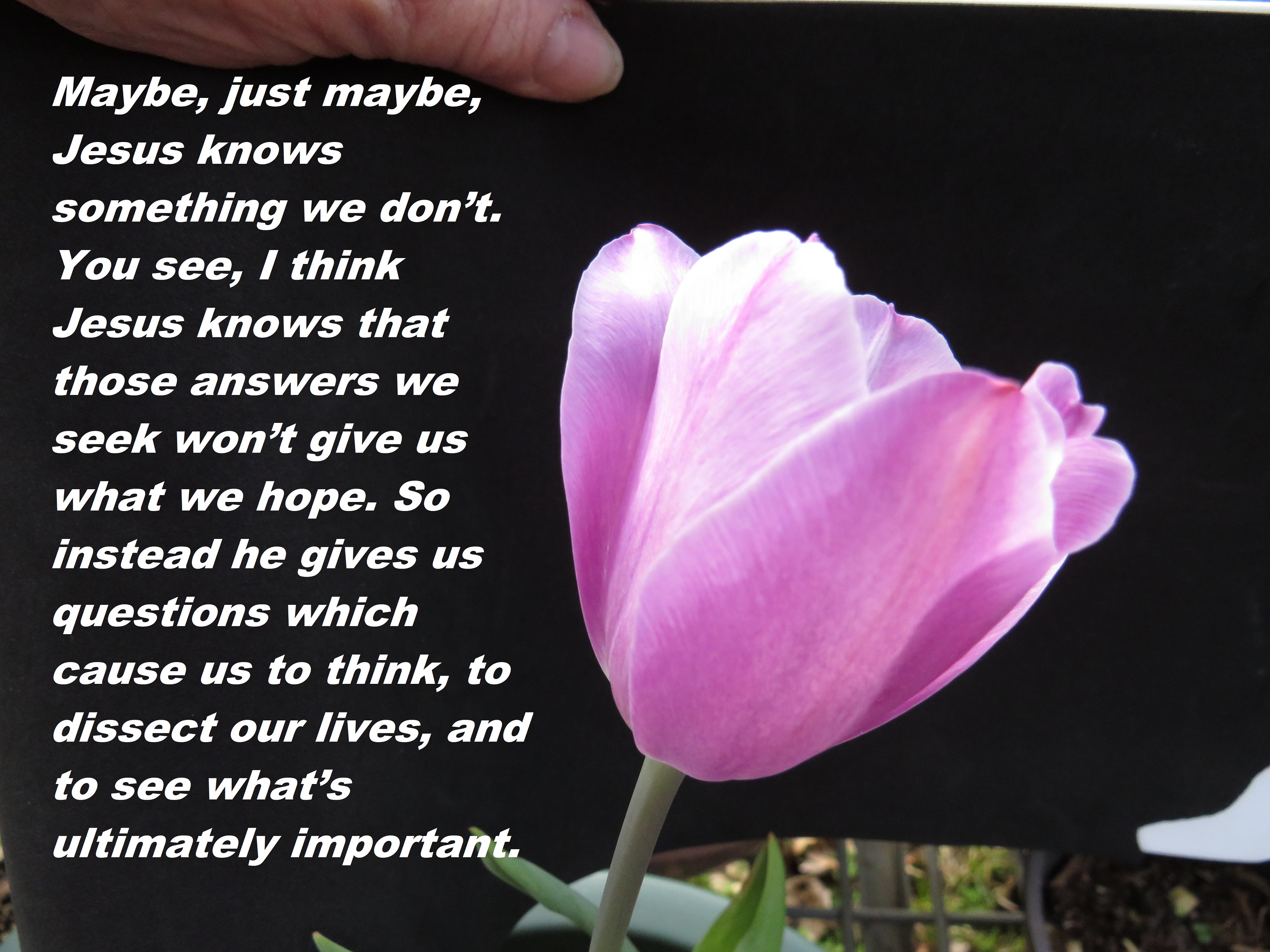 Maybe, just maybe, Jesus knows something we don’t. You see, I think Jesus knows that those answers we seek won’t give us what we hope. So instead, he gives us questions which cause us to think, to dissect our lives, and to see what’s ultimately important.