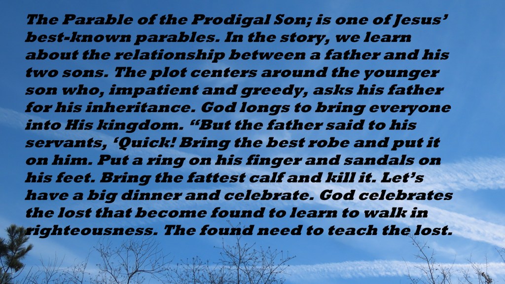 The Parable of the Prodigal Son; is one of Jesus’ best-known parables. In the story, we learn about the relationship between a father and his two sons. The plot centers around the younger son who, impatient and greedy, asks his father for his inheritance. God longs to bring everyone into His kingdom. “But the father said to his servants, ‘Quick! Bring the best robe and put it on him. Put a ring on his finger and sandals on his feet. Bring the fattest calf and kill it. Let’s have a big dinner and celebrate. God celebrates the lost that become found to learn to walk in righteousness. The found need to teach the lost.