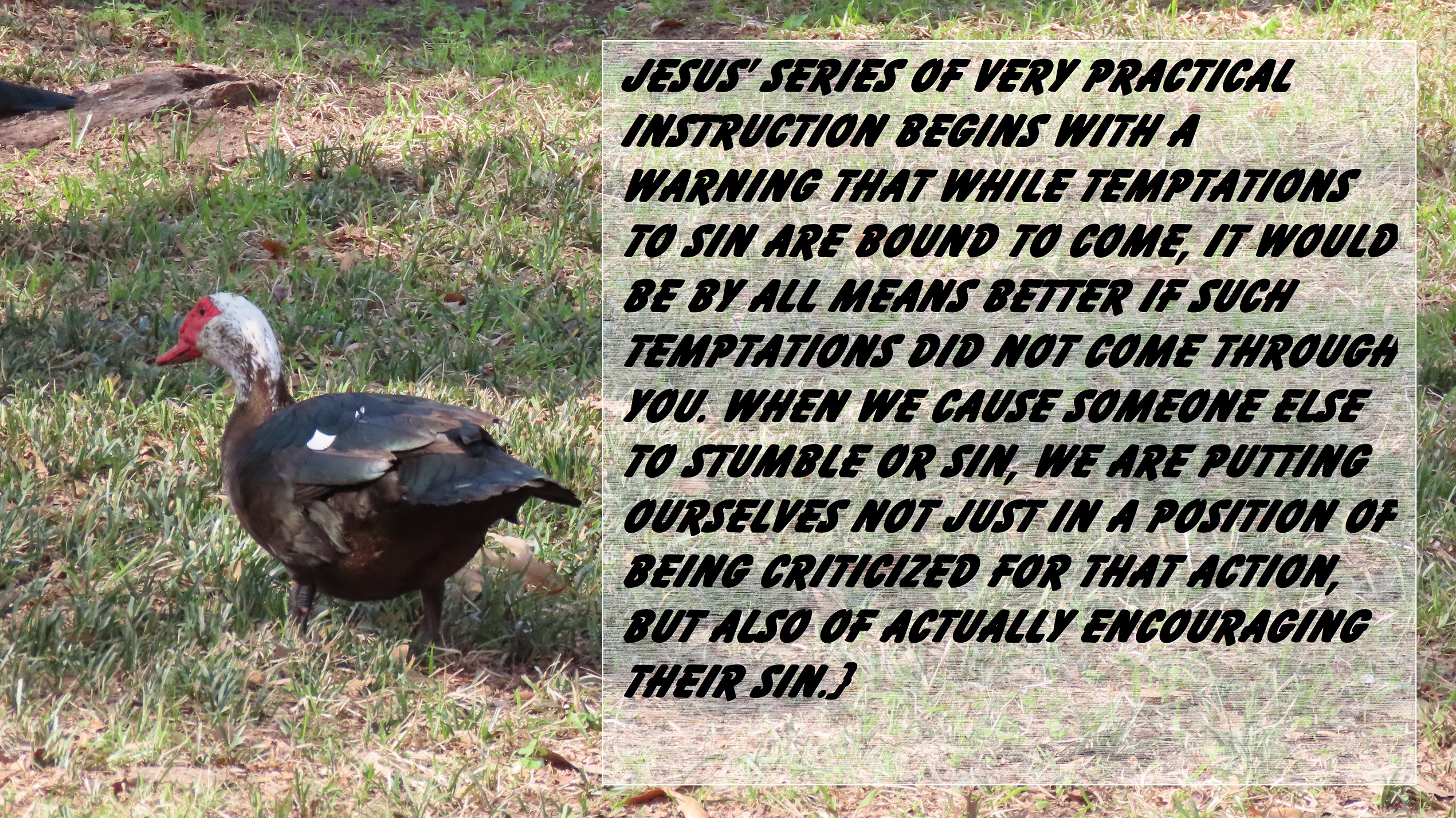 {Jesus’ series of very practical instruction begins with a warning that while temptations to sin are bound to come, it would be by all means better if such temptations did not come through you. When we cause someone else to stumble or sin, we are putting ourselves not just in a position of being criticized for that action, but also of actually encouraging their sin.}